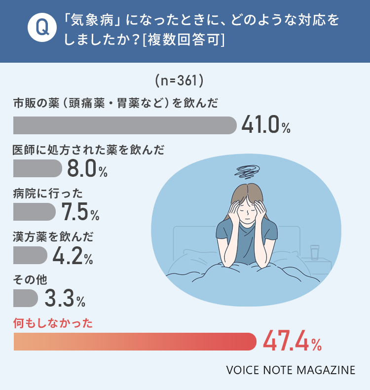 気象病の症状が出たときの対応について、47.4%の方は「何もしなかった」ようです。