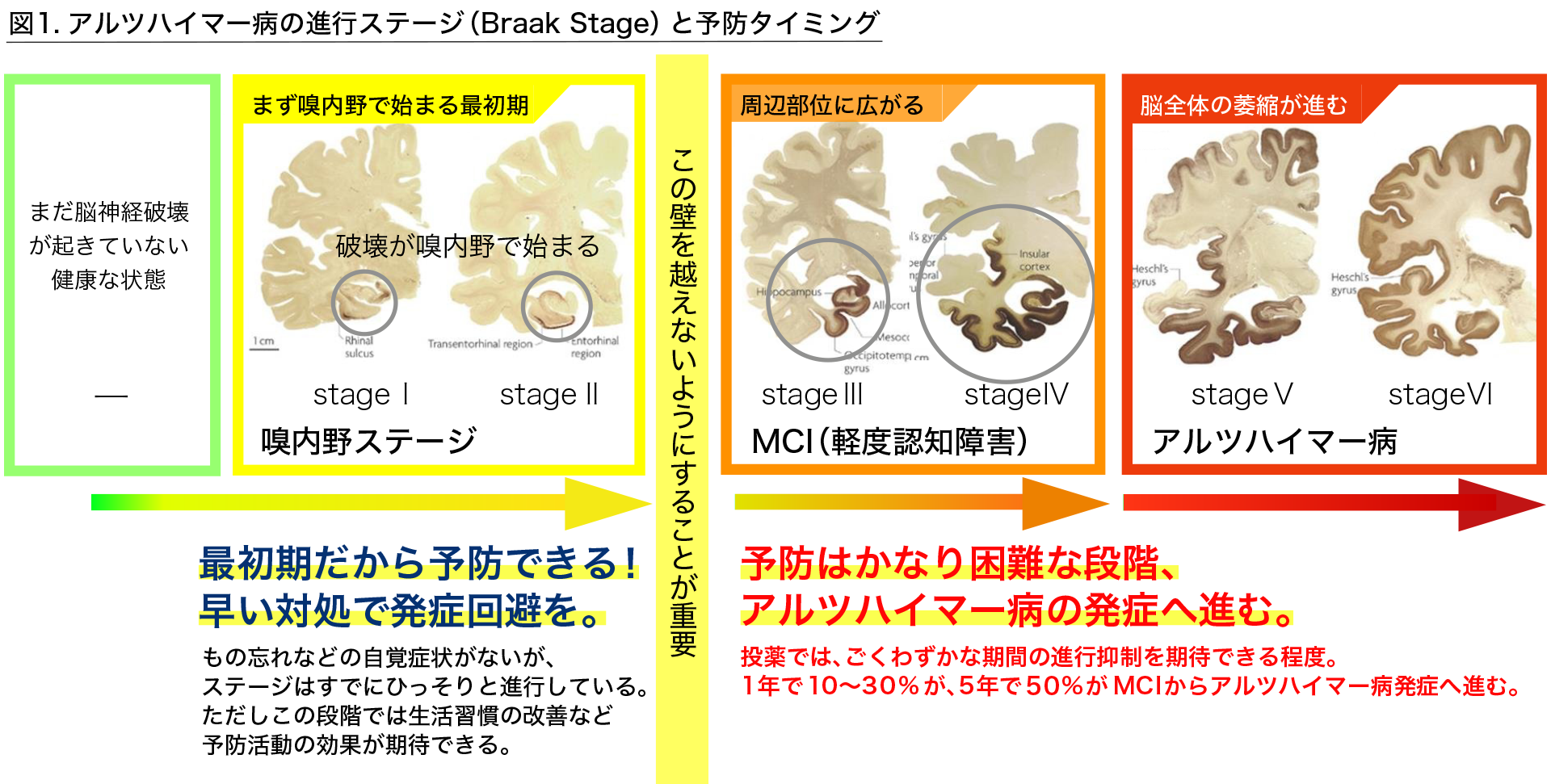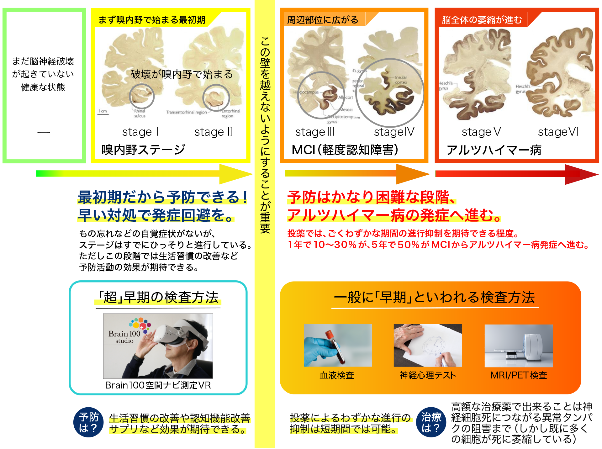 驚くことにアルツハイマー病の「最初期」段階である嗅内野での脳神経細胞の破壊が始まっている方(Braak Stage I)は40代でも約50%います。しかし自覚症状が全く無い上に、既存の検査方法では「健常者」と判定されるために、知らないうちにそのまま進行しているのが現状です。発症リスク低減活動(予防活動)も最初期から始めると高い効果が期待出来ることが世界中で実施された疫学的研究からも分かっています。
