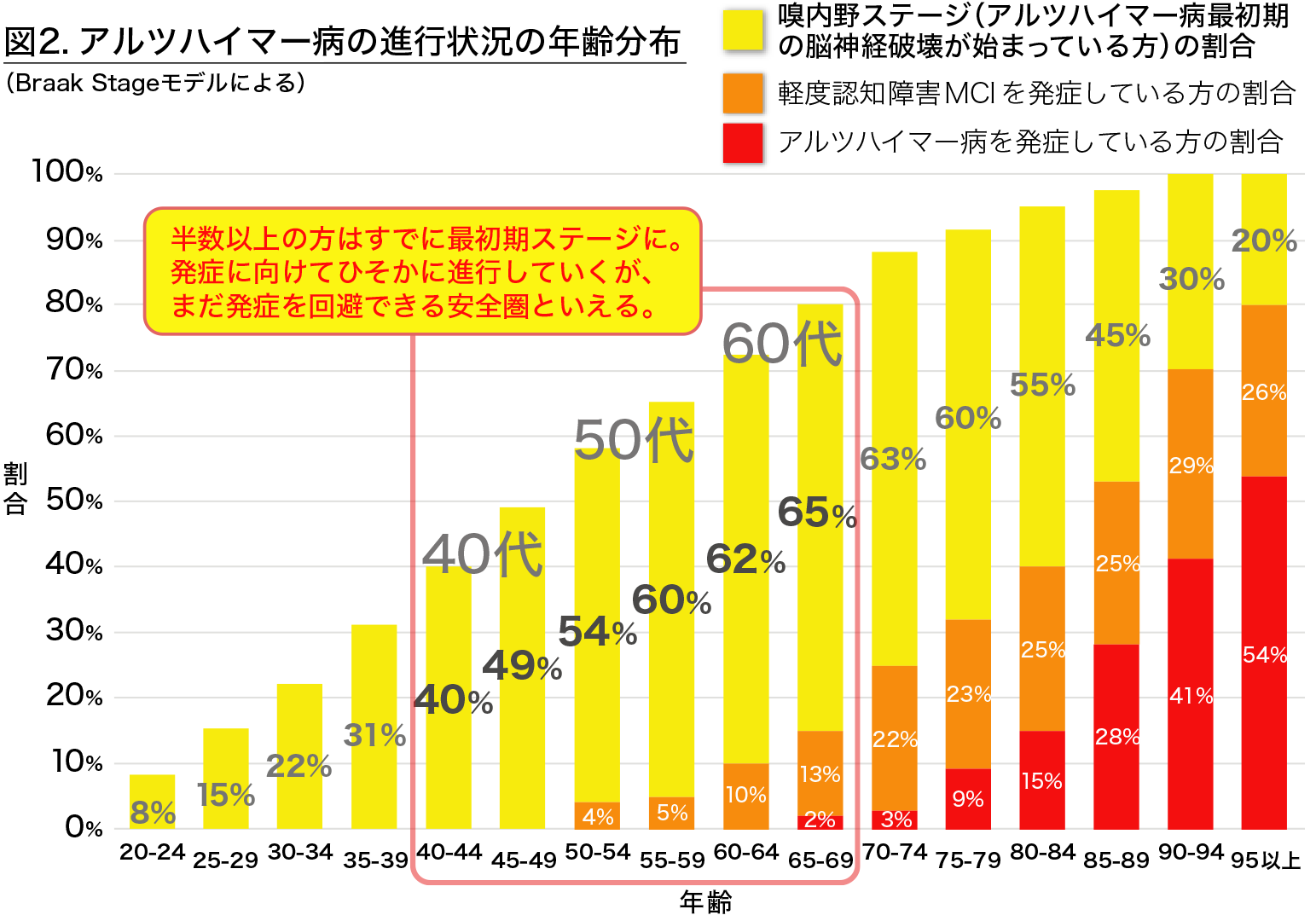 50代の半分に、やがて発症につながる最初期の症状「嗅内野部位での脳神経の破壊」が認められています。しかし中には70歳でその段階に至る、と健康な方もいらっしゃいますから年齢はあくまで目安です。