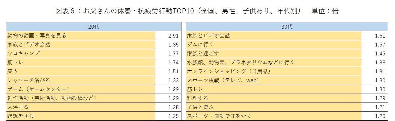 - 年代別休養・抗疲労行動TOP10! 50代は運動などアクティブに過ごすお父さんが元気
