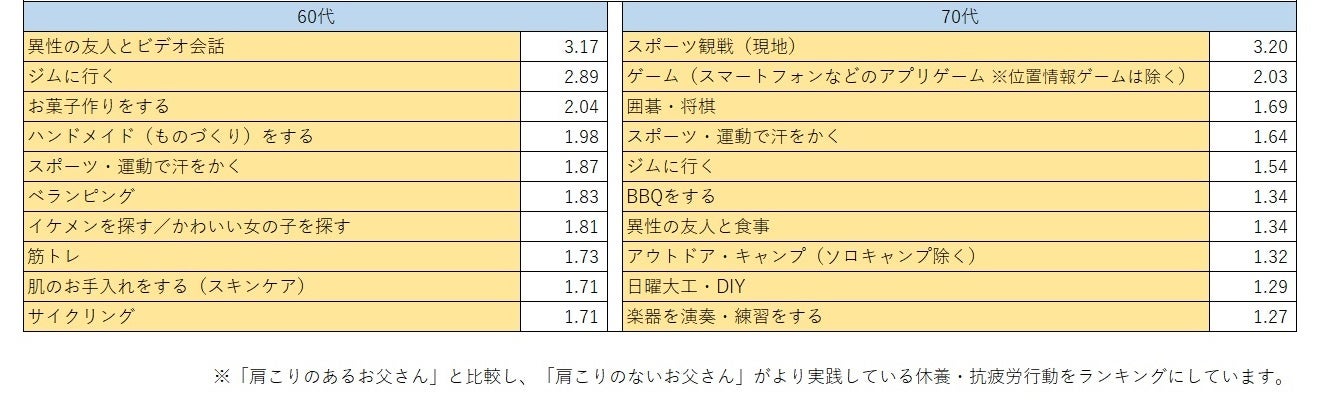 最後に、「肩こりがあるお父さん」と比較して「肩こりがないお父さん」の実践率が高い、疲労解消のために行なっていること、つまり休養・抗疲労行動の年代別TOP10を発表します。