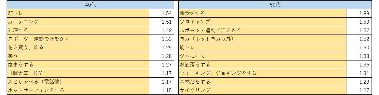 運動もランクインしていますが、「ガーデニング」「料理する」「家事をする」「日曜大工・DIY」など、おうちで創造的に打ち込めることを実践している傾向があります。