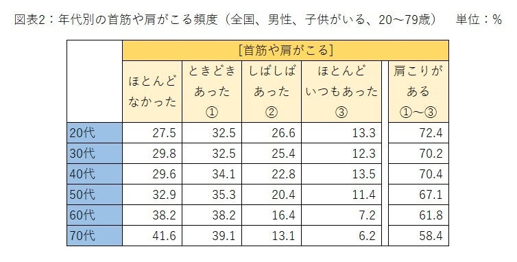 年代別で肩こりの頻度を見ると、20~40代の若年層のお父さんが肩こりを抱えている割合が高いことがわかりました。このことより、成長期で活発に活動する時期の子どもを持つお父さんが首筋や肩こりに悩んでいると推測できます。