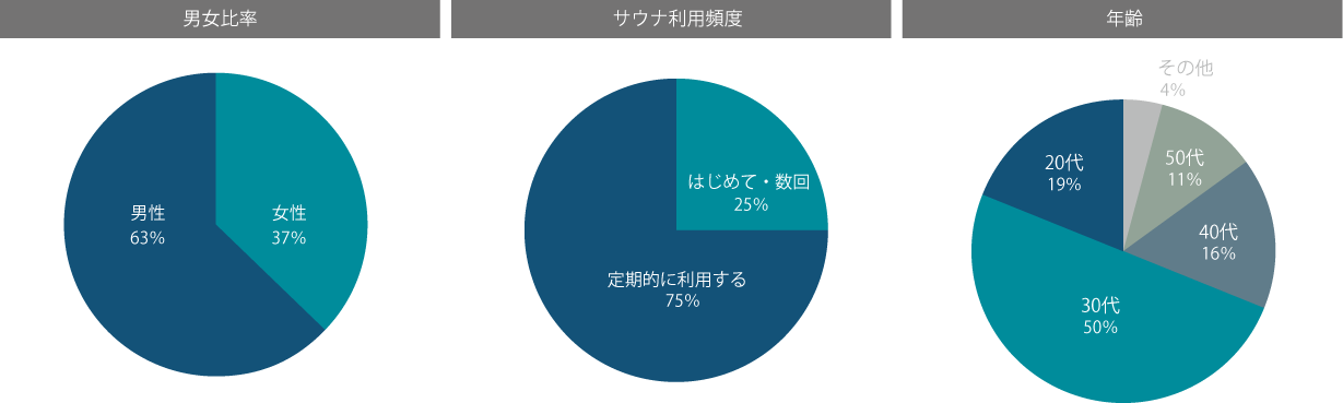 男性専用のサウナ専門店が多い中、男女問わず、また初心者からサウナ愛好家まで幅広くご利用いただいております。女性利用の割合は37%、サウナを初めてご利用になるお客様やサウナを数回しか利用したことが無いお客様の割合は25%。