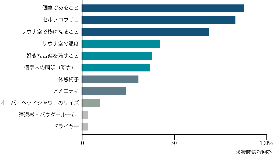 個室であること、自分のタイミングでロウリュができること、サウナ室で横になれることに好評をいただいております。
