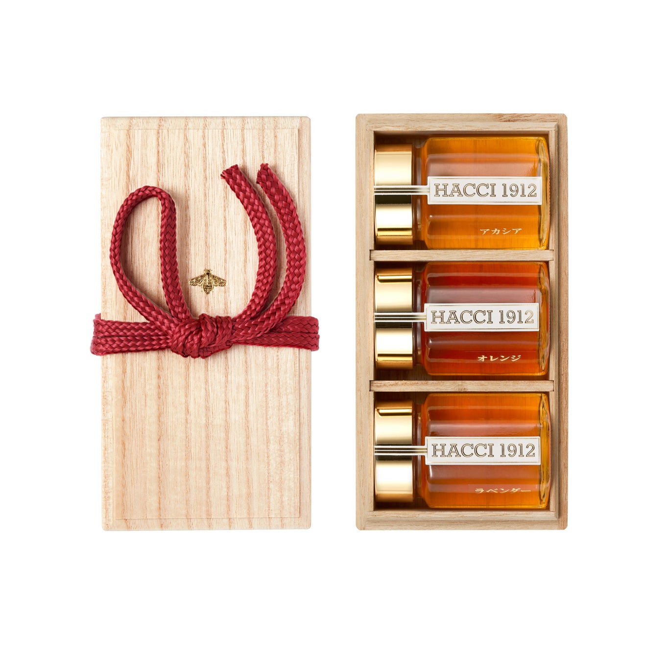 不動の人気はちみつ『ハンガリー産アカシア』、程よい酸味と優しい甘みを楽しめる『メキシコ産オレンジ』、澄んだアロマティックな香りが特徴の『スペイン産ラベンダー』をHACCI オリジナル桐箱でお届け。はちみつの風味を堪能できるセットは大切な方へとっておきの品です。