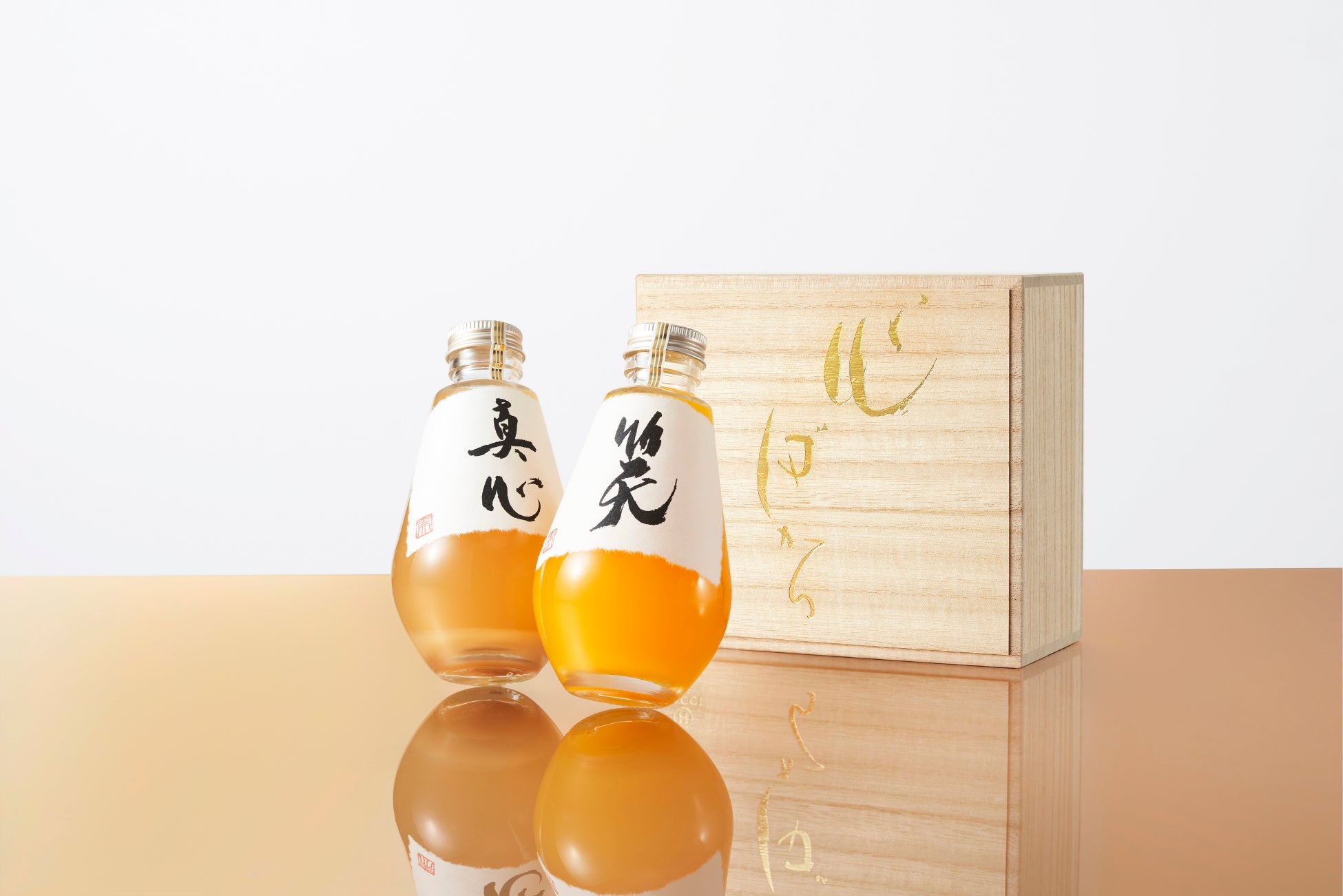 上品で優しい味わいのはちみつをベースに、輝く太陽と美しい水の恵みによって育った岡山温州みかんと牛窓檸檬を使用した爽やかな旨みを感じる2種のドリンク。心を和ませる喜びと笑みをお届けしたいとの想いを込め、「心ばかり」のメッセージが書かれた高級感の漂う桐箱に加え、和紙ラベルは「真心」・「笑(えみ)」・「㐂 (よろこび) 」・「わらい」 の4 種類から選べる言葉をご用意。