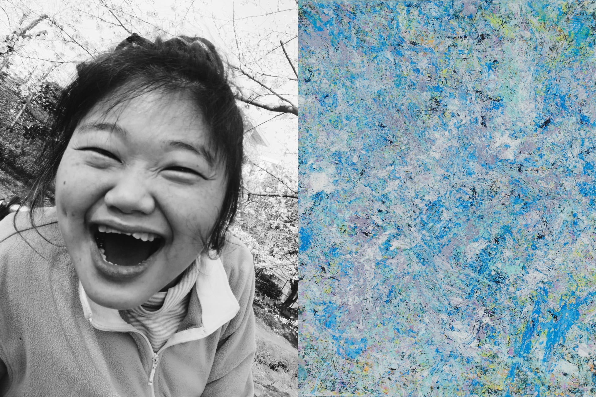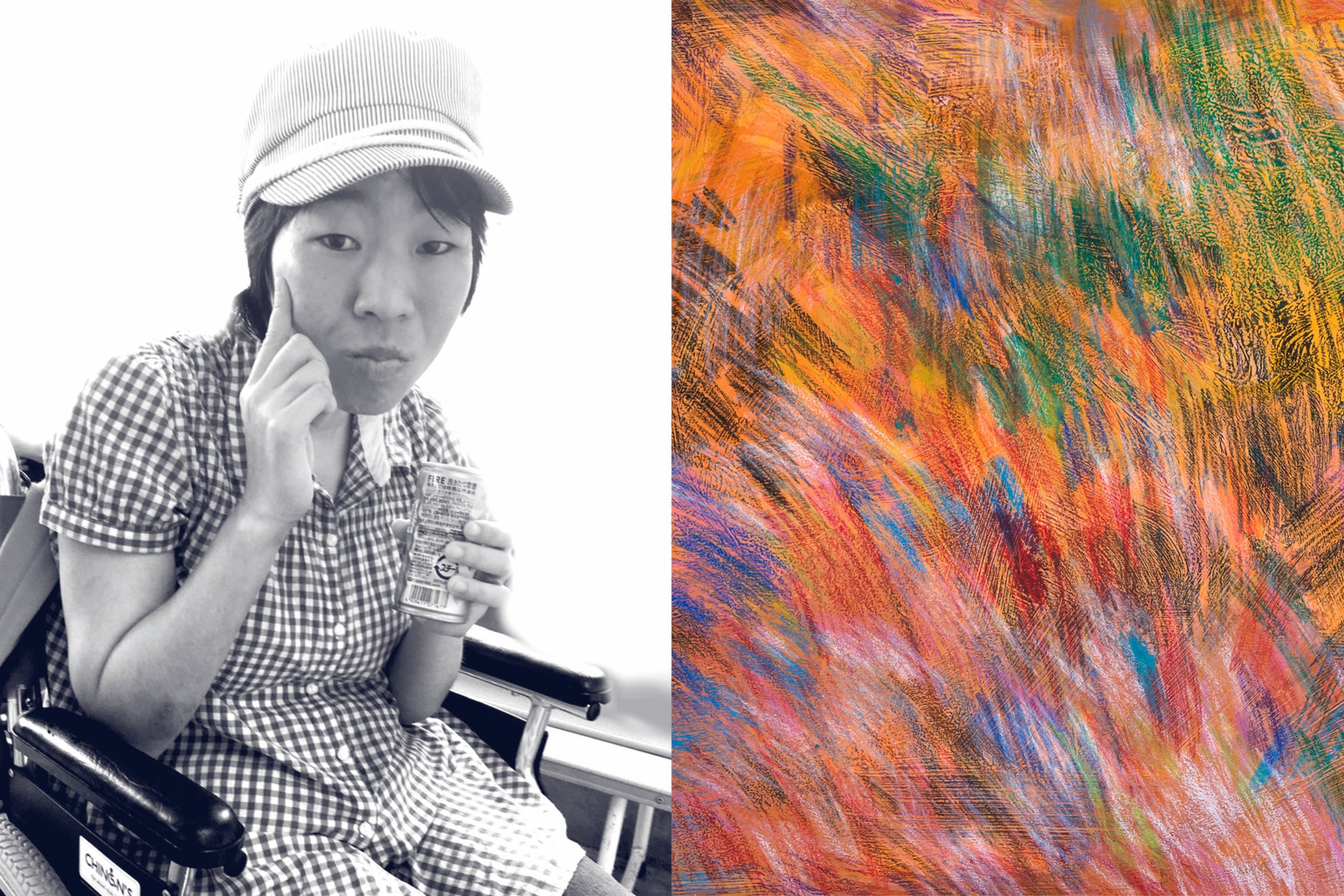歩くことが大好きで車椅子に座っていても気分が良くなると両足がぴょんぴょんと跳ねる。絵画の時間も歩きながら鈴の音がする筆を持って、叩くように時に撫でるように楽しみながら絵を描く。踊るように描く様子は楽しさを連想させる。弾けるタッチで楽しかった思い出が蘇っているようだ。