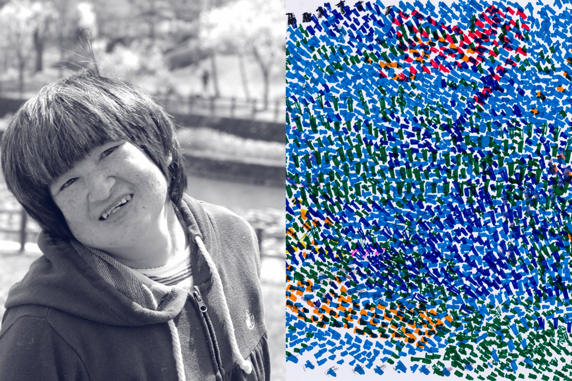 クーピーペンシルやクレヨンを塗り重ねることで作り上げられた作品は、一見すると、素早い鉛筆の動きを要する激しい制作態度を連想させる。しかし実は、彼女の制作は非常にゆっくりと穏やかである。彼女の描き出すひとつひとつの色は、お互いに交じり合うことなく、それぞれにその美しさを主張しながら画面の上に現れ、激しさと静けさが不思議に同居しており、心を惹きつけられずにはいられない。