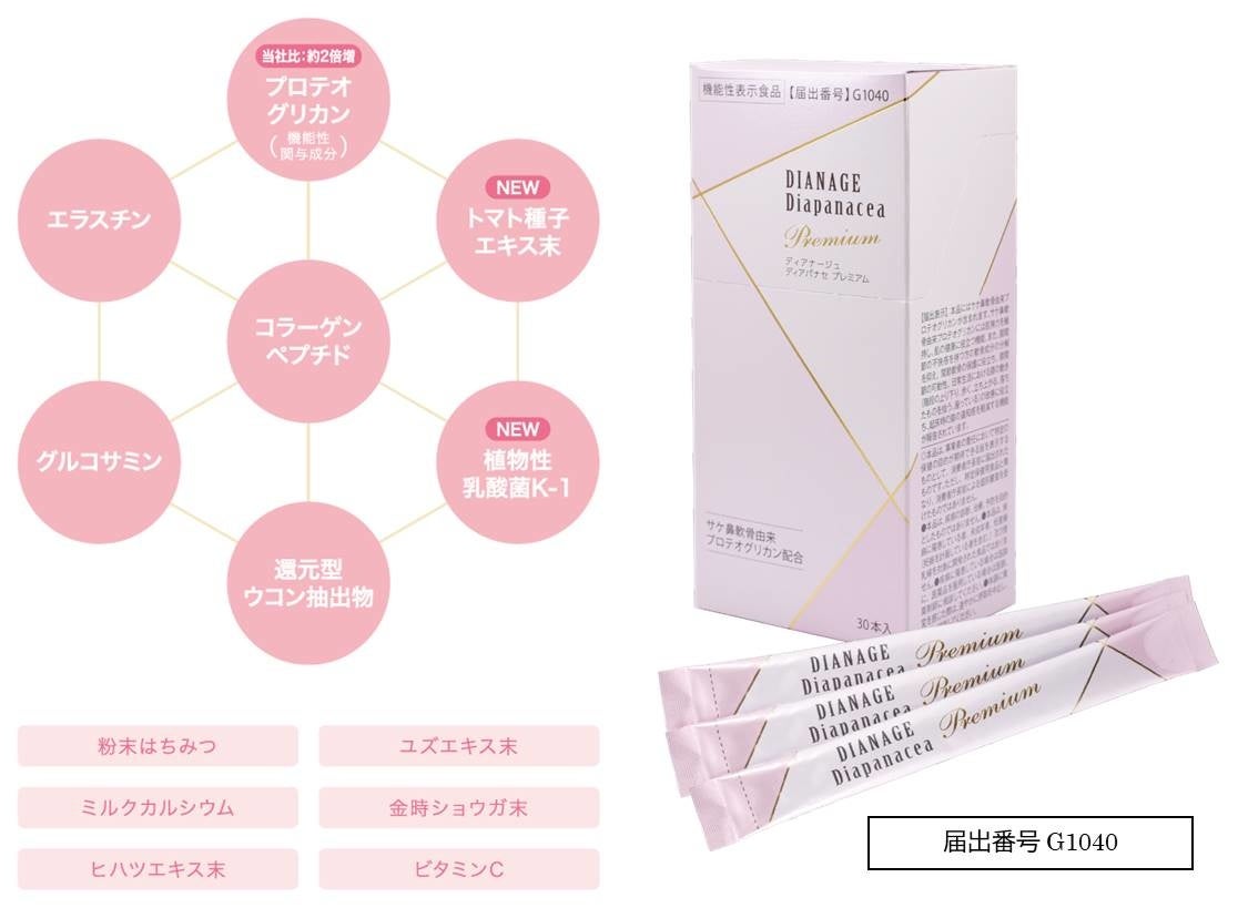 今回のリニューアルでは、機能性関与成分としてプロテオグリカンを約2倍に増量し、機能性表示食品の「ディアパナセ プレミアム」として生まれ変わりました。1日あたり2本の摂取で肌の健康(肌弾力)維持、3本の摂取で膝関節の不快感の軽減の効果が期待できます。