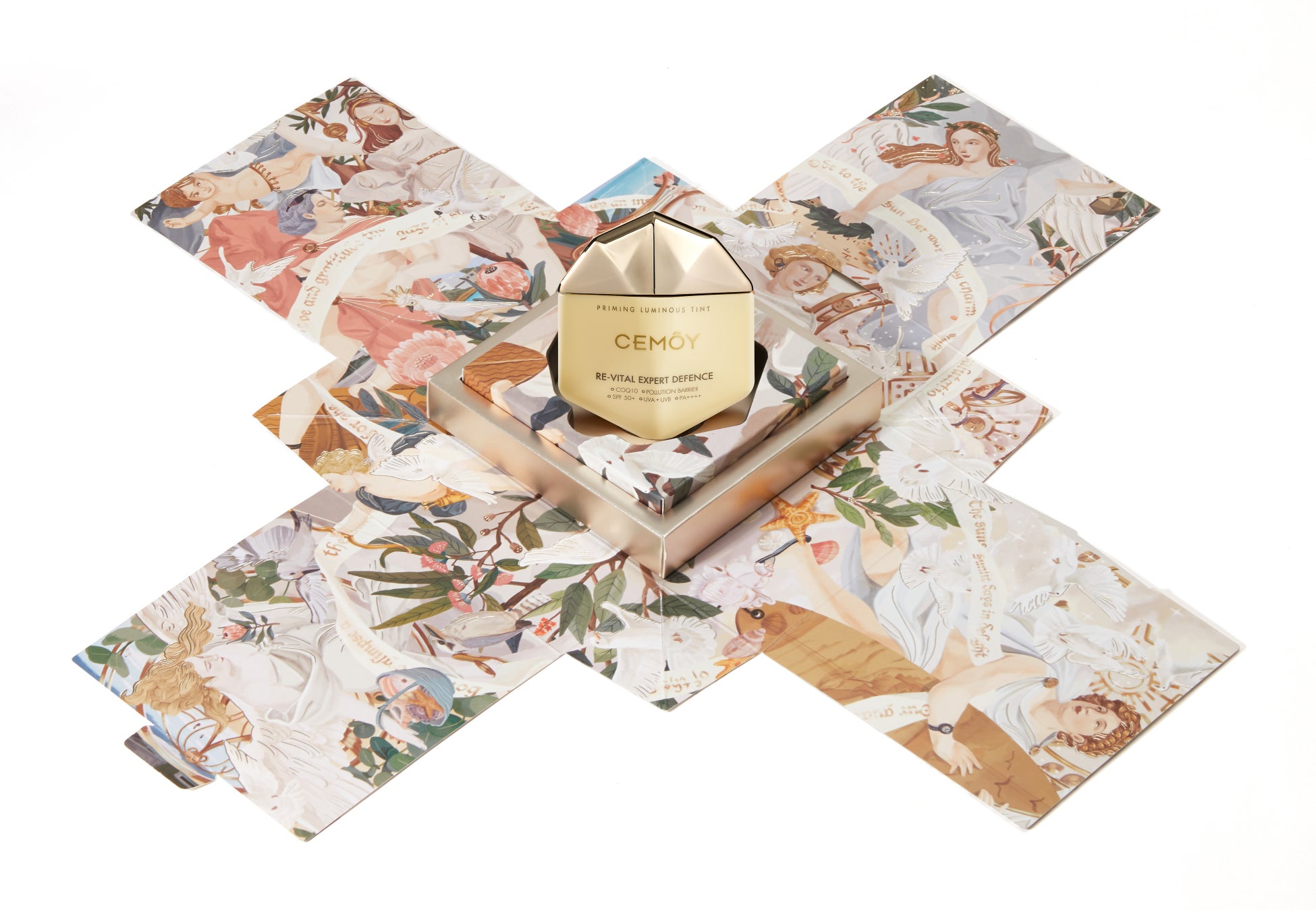 CEMOYのもう一つのこだわりであるラッピング。手にする人に「美のインスピレーション」を提供したいと、そのアート性にあります。製品一つひとつのコンセプトに基づいてボトルやジャーは一から設計とデザインを手掛けています。美しい色彩と造形美、さらに華やかで遊び心溢れたラッピングを施し、開けるたびに心躍る、美のギフトを日本に、あなたに。
