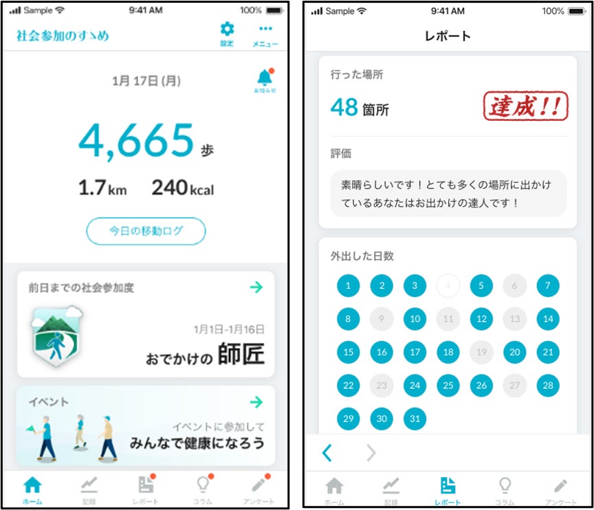 本アプリは、スマートフォンを持ち歩くだけで、利用者の社会参加の度合いを自動で測定し、レポートやグラフなどで確認できるほか、健康長寿の秘訣や社会参加に関する正しい知識を分かりやすく紹介したコラムを配信するなど、利用者は楽しみながら社会参加のきっかけを作ることができます。