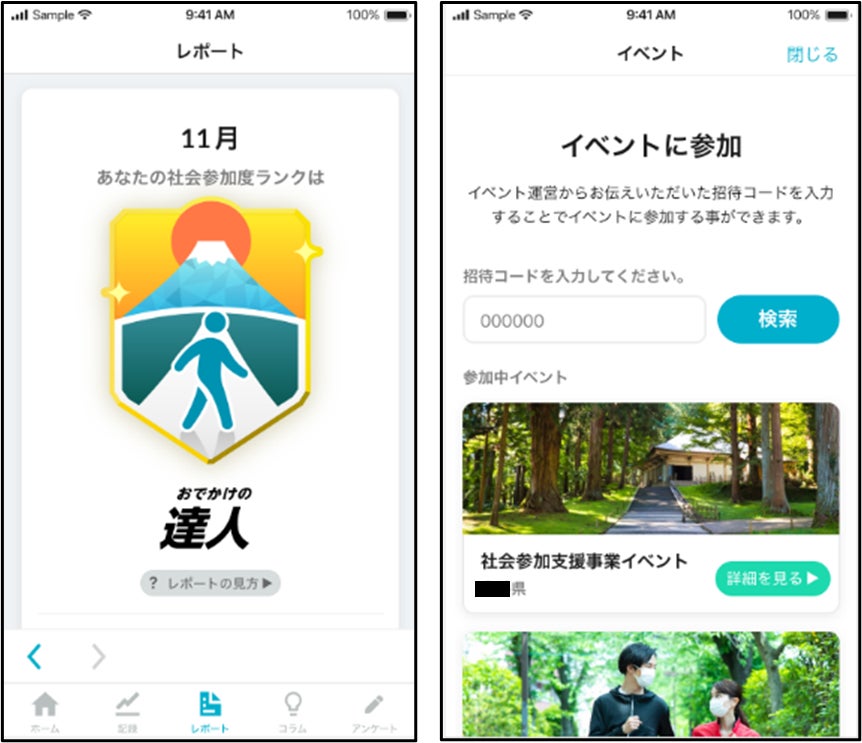 また、招待コードを入力することで、特定コミュニティに参加することができ、お住まいの自治体が主催するイベントや、趣味のサークルなどの案内を随時アプリ内で確認するなど、社会参加の輪を広げることが可能です。
