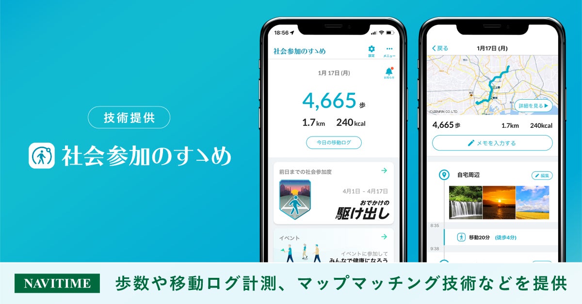 株式会社ナビタイムジャパン(代表取締役社長:大西 啓介、本社:東京都港区)は、株式会社日立製作所(執行役社長兼CEO:小島 啓二、本社:東京都千代田区)が2022年6月3日(金)に提供開始する『社会参加のすゝめ』アプリの開発に技術協力いたしました。