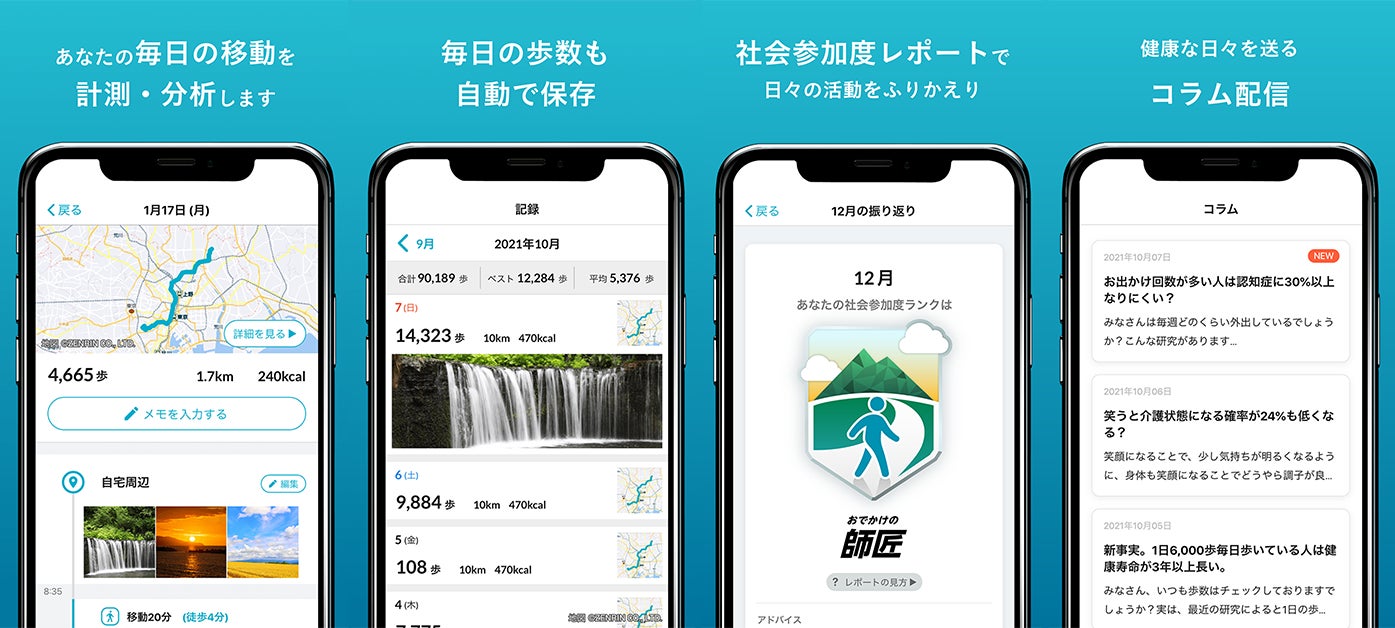 そのデータをもとに移動状況の可視化や、社会参加活発度を4つのランクで分類して健康アドバイスを行い、社会参加への状態を提示、利用者自身でお出かけの現状や動向を把握できます。また健康長寿に関する研究をもとにした社会参加への効果をシニア向けにわかりやすくコラムで紹介し、介護予防につながる自主的な行動改善を促進いたします。