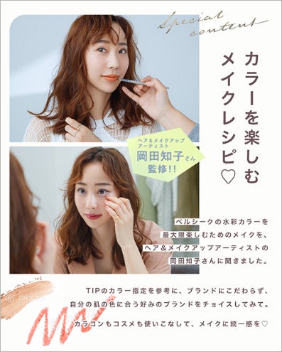 『BELLSiQUE』 ブランドサイトにて、ヘア&メイクアップアーティスト・岡田知子さん監修のスペシャルコンテンツ「カラーを楽しむメイクレシピ♡」を公開中。レンズの色味とアイシャドウ・リップなどの色味を合わせることで統一感を演出するなど、真似するだけで簡単にワンランク上のおしゃれがお楽しみいただけます。全6種類それぞれのレンズにおすすめのメイク術を紹介しています。