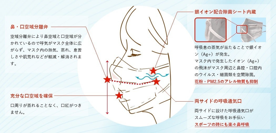 「セパレイトエアーマスク」は、マスクの内側に仕切弁をつくることで口と鼻の空域を「分離」し、鼻呼吸をする領域の両サイドには、抗除菌(AG +)フィルターを搭載した呼吸通気口を設けています。これにより、呼吸の熱気や蒸れが溜まりにくく、息苦しさを大幅に軽減しながら、健全で楽な呼吸サイクルを実現します。