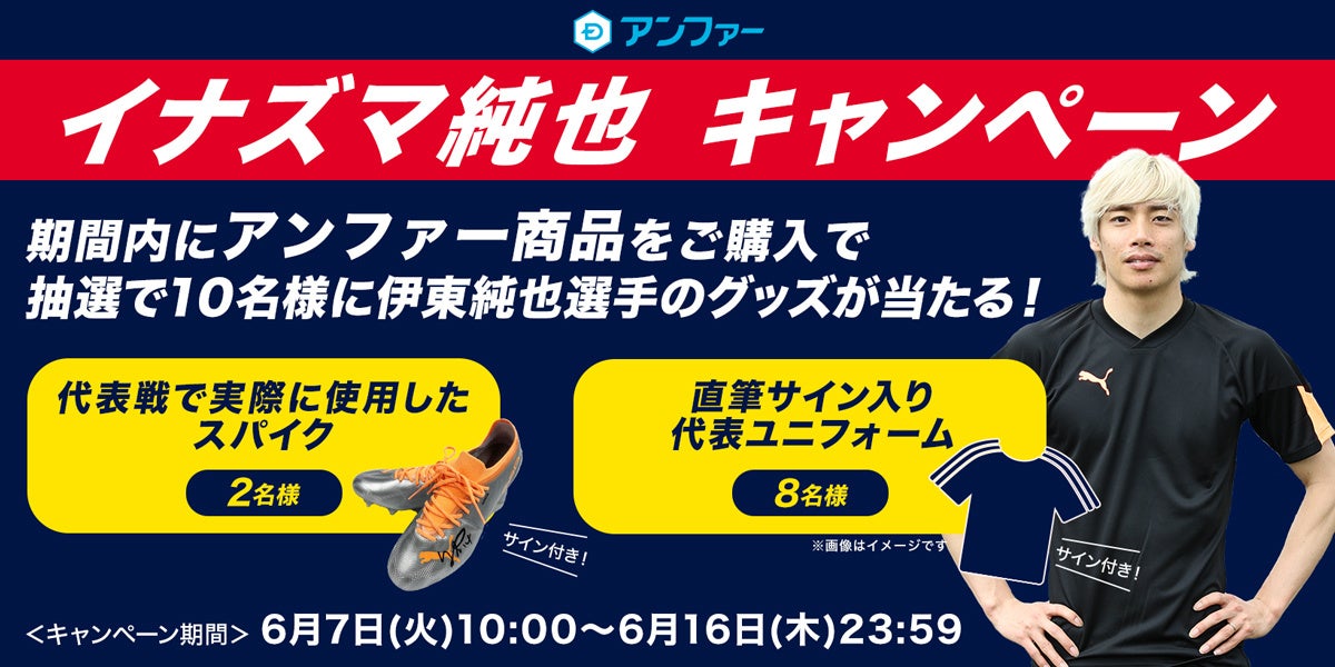 アンファーストアにて商品購入いただいた方から抽選で10名様に伊東純也選手オリジナルグッズが当たるプレゼントキャンペーンを実施します。