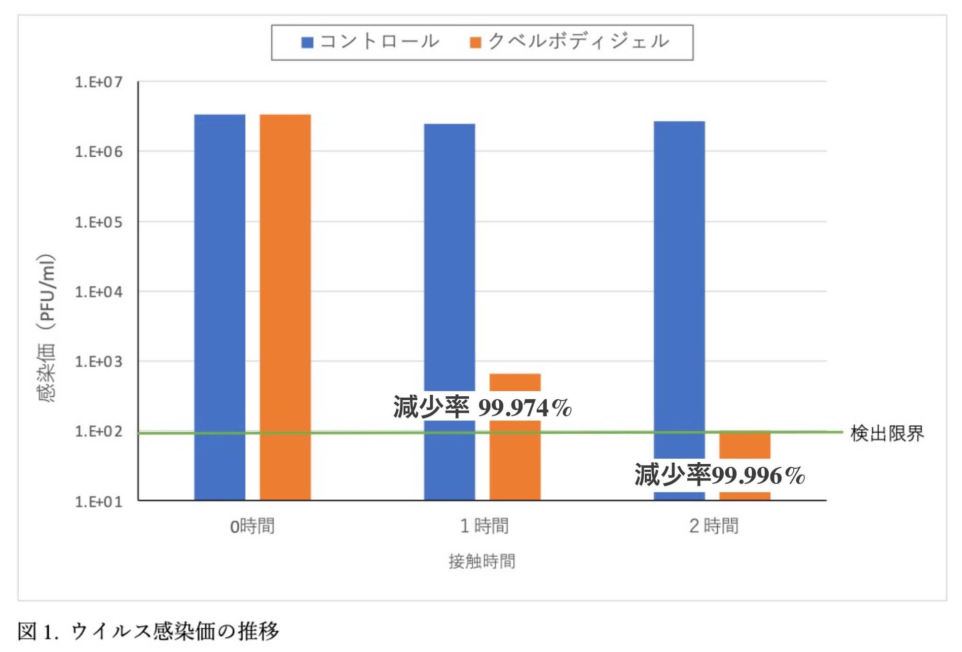 図1のグラフでは新型コロナウイルス(SARS-CoV-2)をクベルボディジェルに接触させると、感染価は1時間後に99.974%の減少率を示し、2時間後には検出限界である99.996%まで減少した。