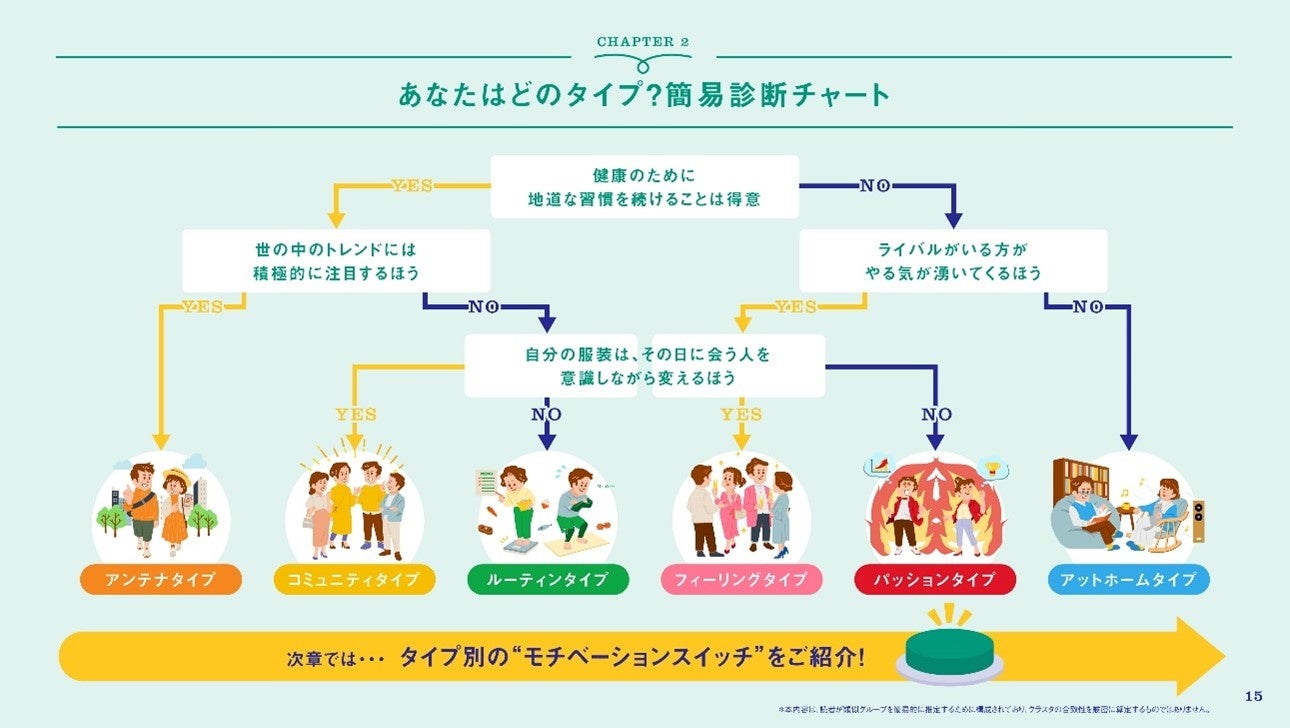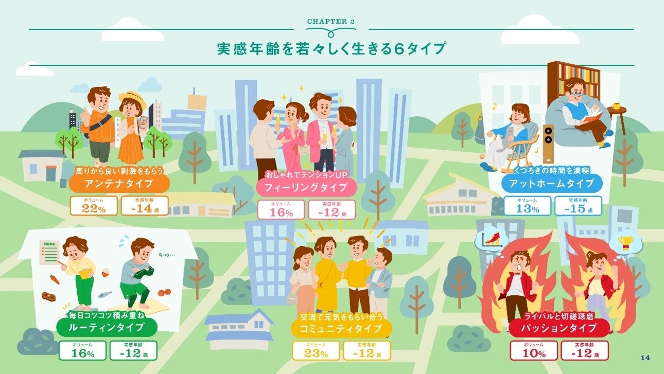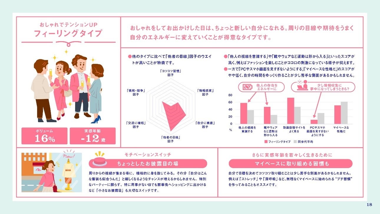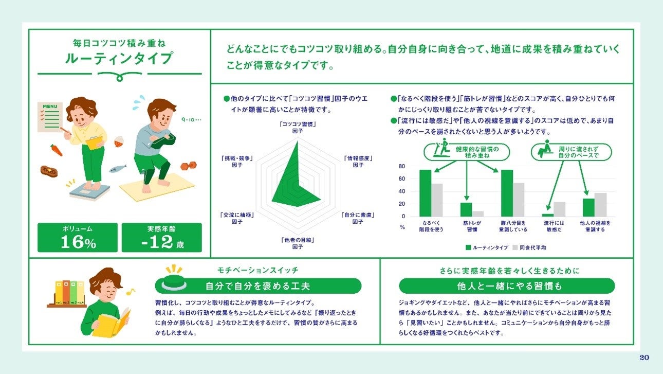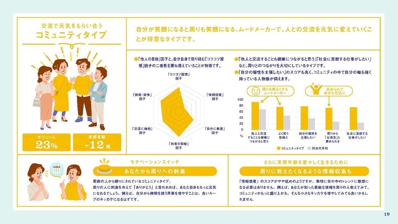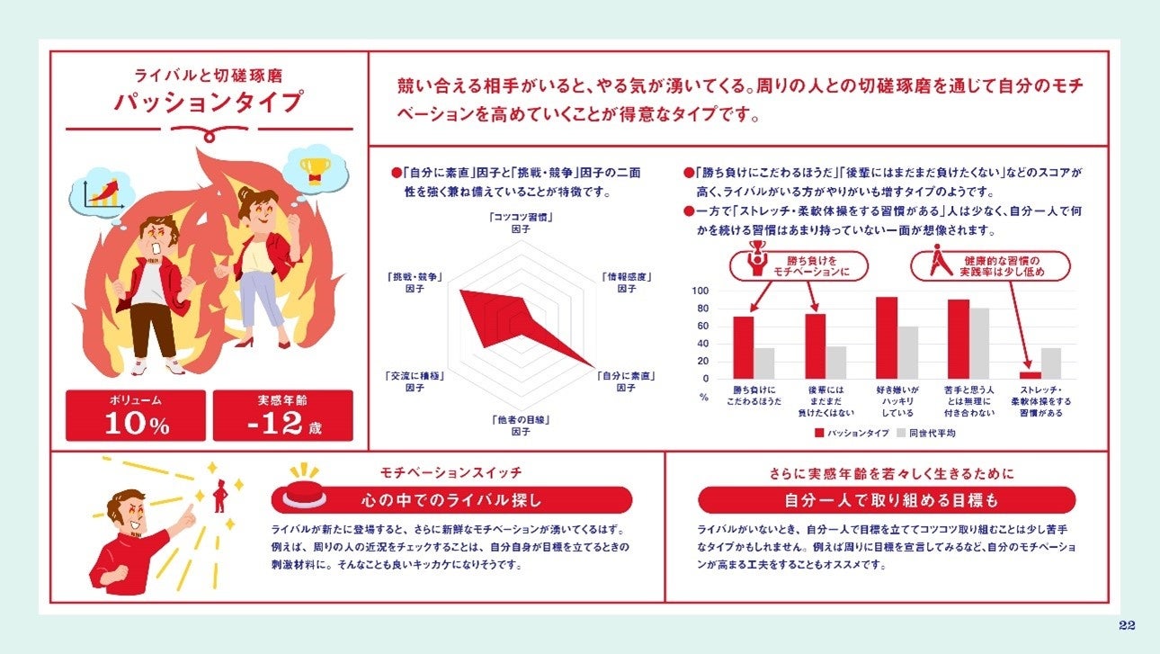 「実感年齢」が同じであっても、その若々しさの在り方は決して一つではありません。カラダとココロは両者を高めていくことが重要ですが、自分自身に合った「実感年齢」を実際の年齢よりも若くする方法は様々なのです。それぞれのタイプを見つけ、さらに各タイプが持つ『モチベーションスイッチ』を入れることで「実感年齢」にさらなる変化をもたらすかもしれません。また、それぞれのタイプは決して単独的かつ普遍的なものではありません。自身のタイプと繋がることのできる別のタイプのヒントをうまく取り入れることで、新しい世界が広がりを見せてくれると考えています。