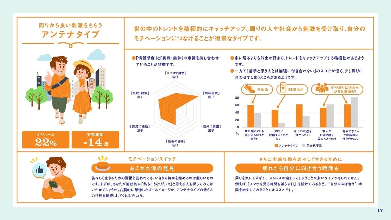 アンテナタイプは「SNSに投稿することが多い」、「家に居るよりも外出するほうが好き」といった積極性があります。「年下の友達を増やしたい」という意向も強く、周りの人や社会から刺激を受け取り、自分のモチベーションにつなげることが得意なタイプです。自身が直感的に「私もこうなりたい!」と思えるゴールイメージとなる人を探すことが「実感年齢」を実際の年齢よりも若くするヒントになるでしょう。