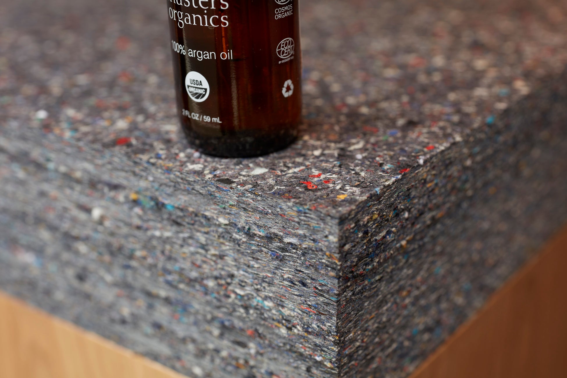 什器デザイン製作を通して「循環型社会の構築」と「テクノロジーの未来」への貢献を目指す WORKSTUDIO。ファッションロスの削減と循環型社会 をめざして開発された「PANECO®」は、廃棄衣料品を原料としたサスティナブルな循環型繊維リサイクルボードです。また、使用後は回収し再びボー ドとしてリサイクルすることができます。「PANECO®」はファッションとインテリアの世界をつなぐ新たな循環型生産モデルを提案・実現するとともに、 環境負荷を削減し、持続可能な未来をめざす優良素材です。