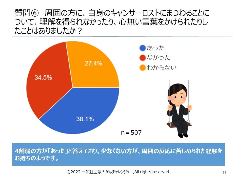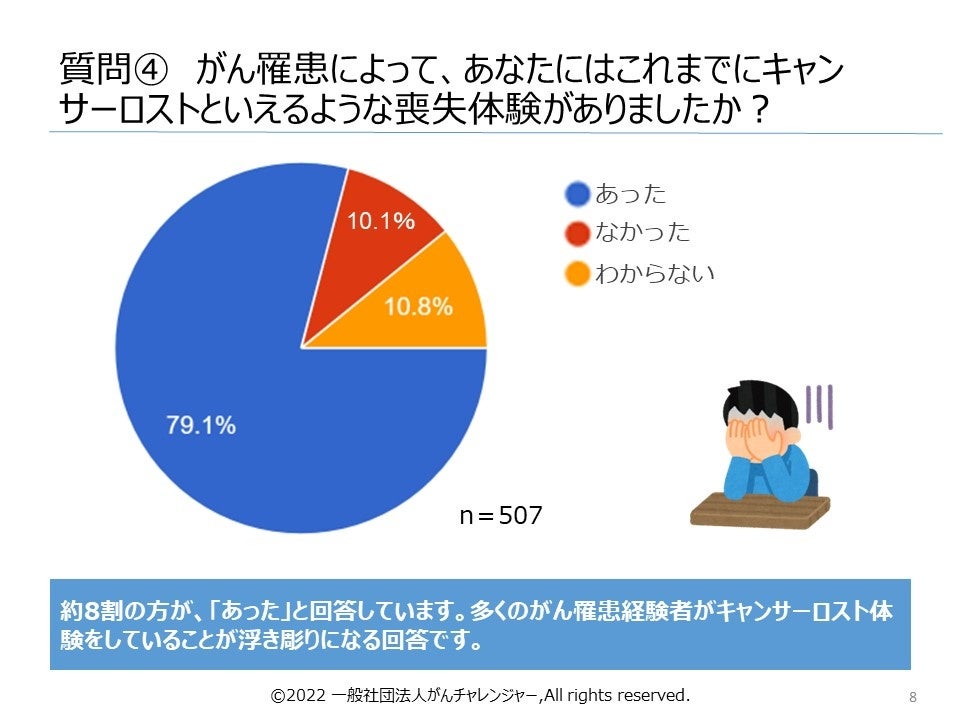 そしてこの度、がん罹患経験者の方々が、健康面の他に何を失い、それに対してどのように感じていらっしゃるのか、周囲の方からの反応はどうだったのかなど、がん罹患経験者の抱える「キャンサーロスト」(※)にフォーカスし、アンケートを実施した結果、507名のがん罹患経験者の方々よりリアルな声を寄せていただくいただくことができました。