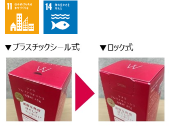 以前は化粧箱に、未使用であることを証明するためのプラスチックシールが貼られていましたが、ミシン目をつけて開封するロック式に変更することで、プラスチックの削減に努めています。