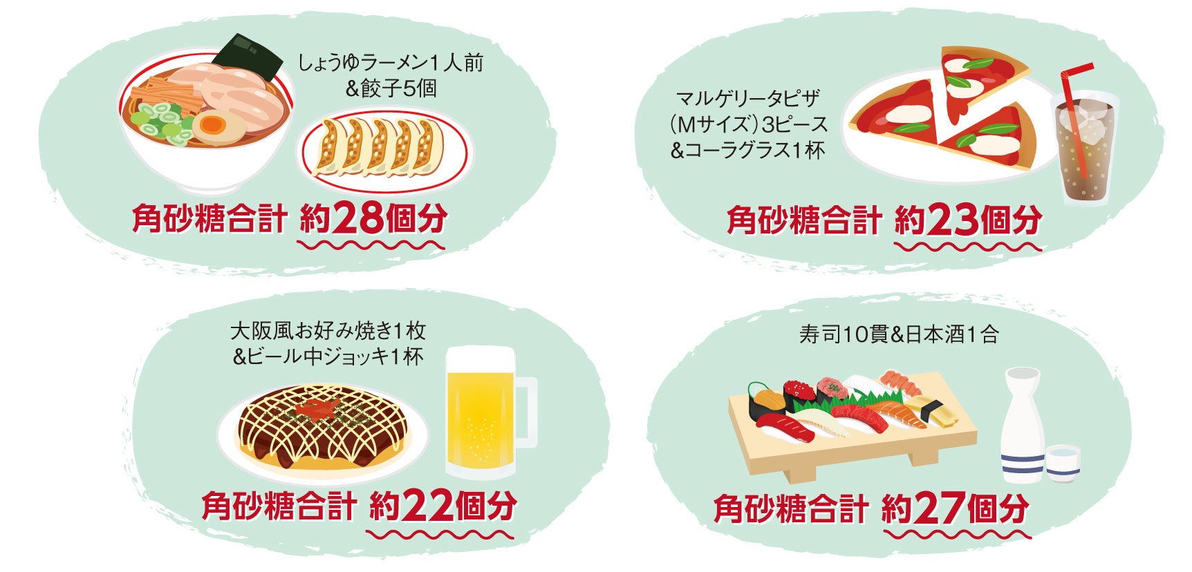 ※食事の糖質量(単糖量)はDHC健康食品相談室監修。角砂糖1個(3g)の単糖量を3.15gとして換算。端数は四捨五入。