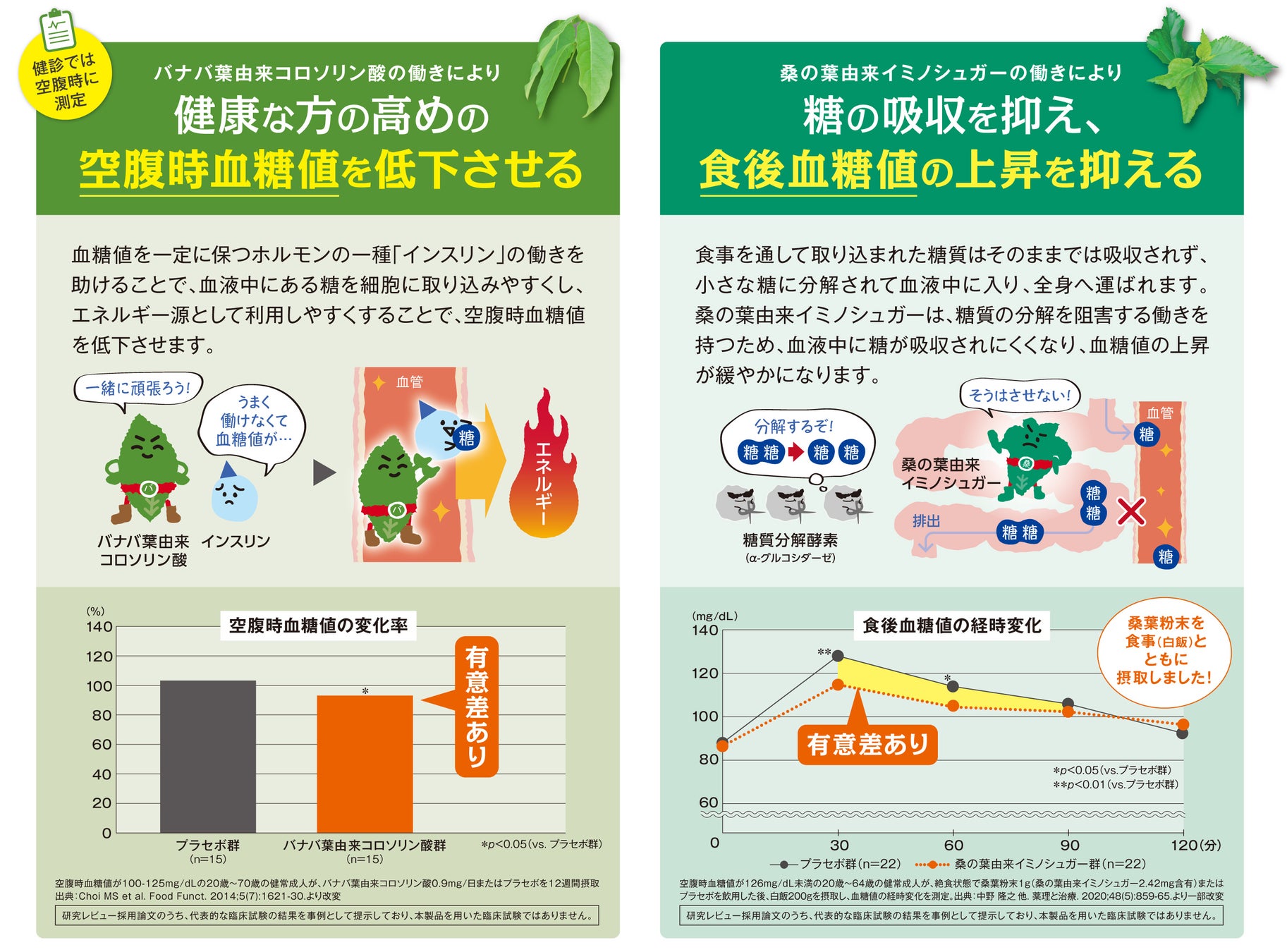 (※)桑の葉由来イミノシュガー、バナバ葉由来コロソリン酸を機能性関与成分として配合した機能性表示食品として