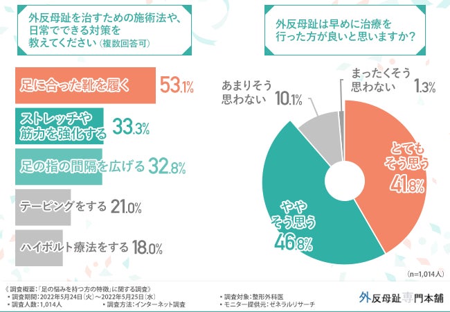 そこで、「外反母趾を治すための施術法や、日常でできる対策を教えてください(複数回答可)」と質問したところ、『足に合った靴を履く(53.1%)』と回答した方が最も多く、次いで『ストレッチや筋力を強化する(33.3%)』『足の指の間隔を広げる(32.8%)』と続きました。