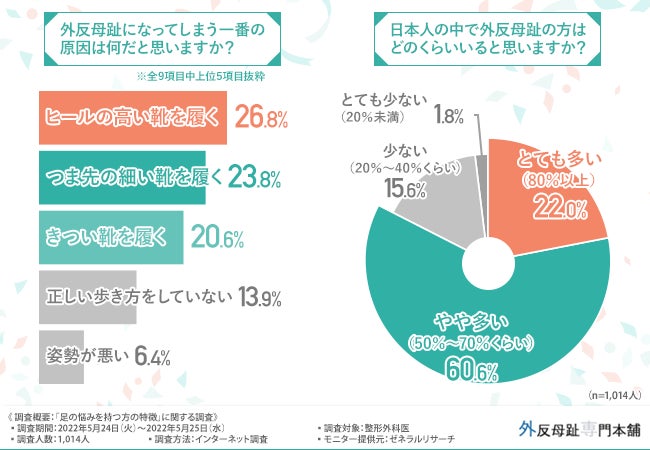 続いて、「日本人の中で外反母趾の方はどのくらいいると思いますか?」と質問したところ、8割以上の方が『とても多い(22.0%)』『やや多い(60.6%)』と回答しました。