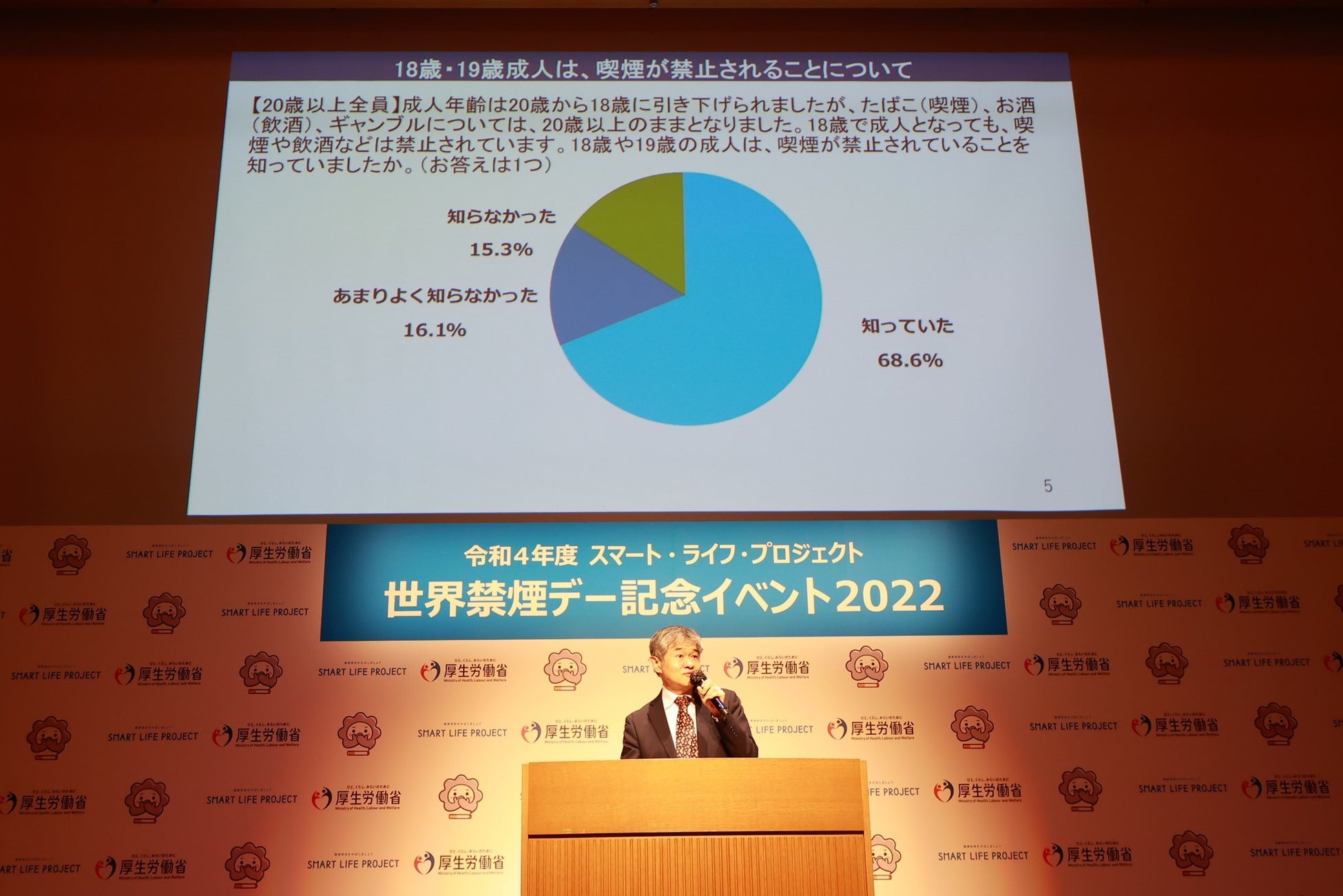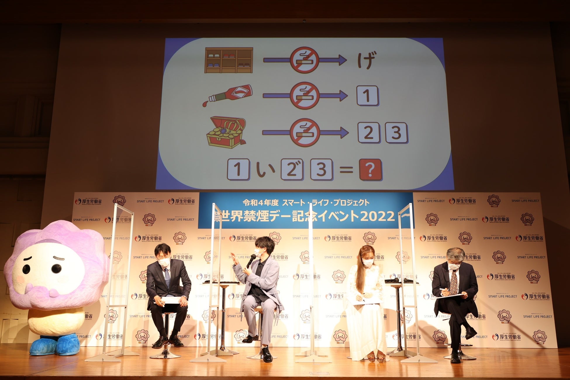 厚生労働省は、WHO(世界保健機関)が定める「世界禁煙デー」の5月31日(火)から6月6日(月)の1週間を「禁煙週間」と定め、たばこ対策に取組んでいます。この度「世界禁煙デー」及び「禁煙週間」を迎えるにあたり、今年度の“スマート・ライフ・プロジェクト オフィシャルアンバサダー”に就任した、謎解きクリエイターの松丸亮吾さんにご登壇いただき、禁煙及び受動喫煙防止の普及啓発を目的とした「世界禁煙デー記念イベント」を開催しました。本イベントは、国民の生活習慣を改善し健康寿命を延ばすために、2011年より実施しているプロジェクト「スマート・ライフ・プロジェクト」の取組の一環として開催するものです。