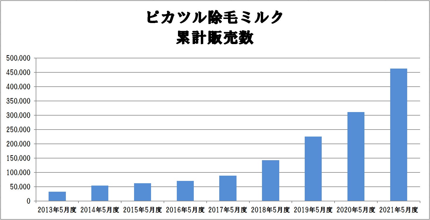 暖かくなるにつれ肌を露出する機会も増え、ムダ毛の処理を行う頻度は増える傾向があります。特に近年は男性で除毛を意識的におこなう方も増えているようです。当社のピカツルシリーズの除毛剤「ピカツル肌除毛ミルク」の販売数もこの10年間で著しく伸長しています。上図は「ピカツル肌除毛ミルク」の販売数グラフです。2017年頃から一気に販売数が伸びているのが分かります。当社では男女兼用で使える「ピカツル肌除毛ミルク」の販売を2012年からしていますが、その需要は増加傾向にあります。そこでさらに吸着・脱臭成分を付加した新商品を発売し、お客様の需要にこたえていきます。