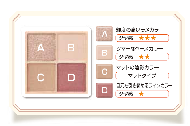 まぶたのくすみを飛ばすシマーパール、陰影を生むマットカラー、立体感をプラスするラメカラーの3つの質感。異なる質感を重ねることで、目元に自然な奥行きをプラスします。ラメカラーにはラメがたっぷり密着しやすいぷにっとしたジェルが配合されています。