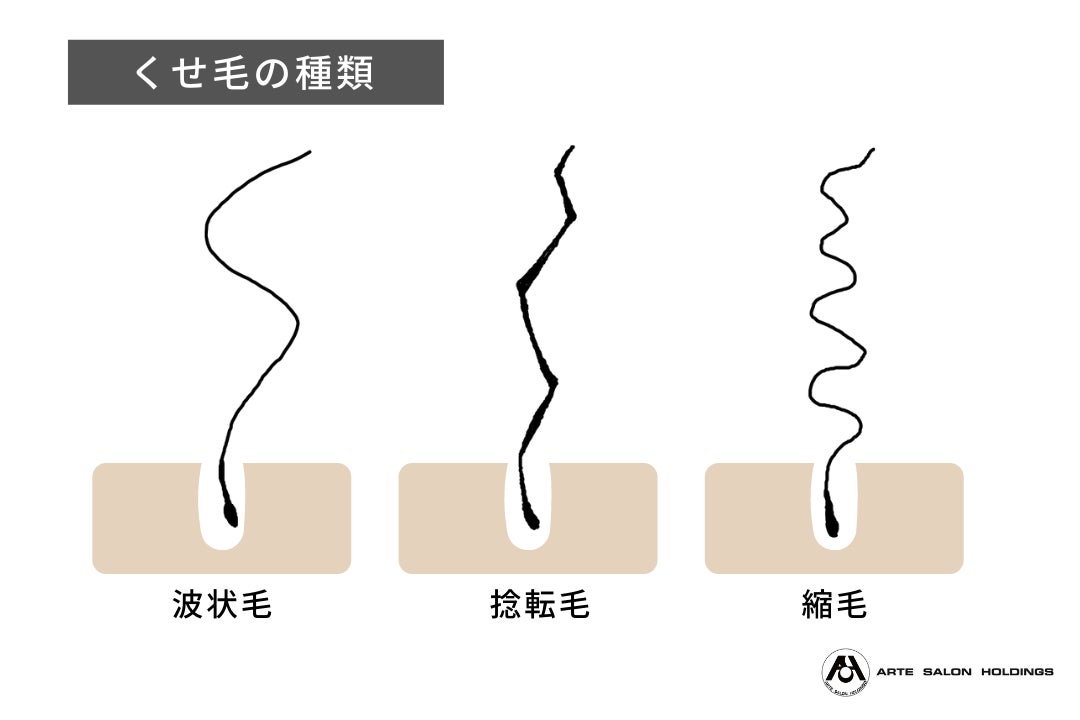 くせ毛にもそれぞれ特徴があり、3つの種類に分けることができます。また、同じ人でも種類の異なったくせ毛が混在していることもあり、フェイスラインや生え際などは毛髪が細く、他の場所に比べてくせが強く出ることもあります。