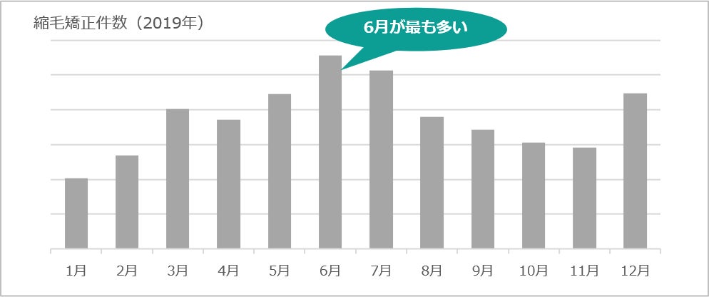当社が展開するデザイン系美容室の「Ash(アッシュ)」には年間約120万人が来店しますが、一年のうち縮毛矯正をかける人が最も多いのは6月(※)です。縮毛矯正はくせ毛をストレートヘアにすることができる施術ですが、かけた部分は半永久的にストレートな状態を保つことができ、毎日ヘアアイロンでストレートにする必要がないためくせ毛のお悩みを解決する施術として梅雨の時期に人気が高まります。