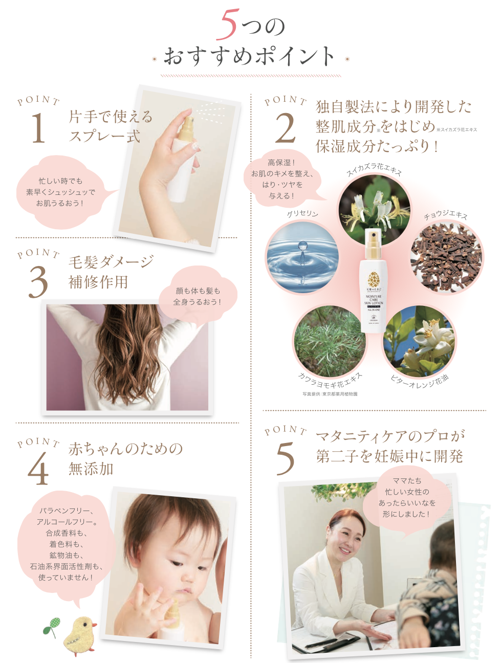 | ①スプレー式:赤ちゃんを抱えたまま片手でスキンケア! ②高保湿:独自製法により開発した整肌成分(スイカヅラ花エキス)配合! ③無添加:ママと赤ちゃんのための無添加! ④毛髪補修:毛髪ダメージ補修作用により髪もうるおう! ⑤ママの肌の専門家が開発:マタニティケアのプロであり医学博士の天使のたまご代表 藤原が開発! |