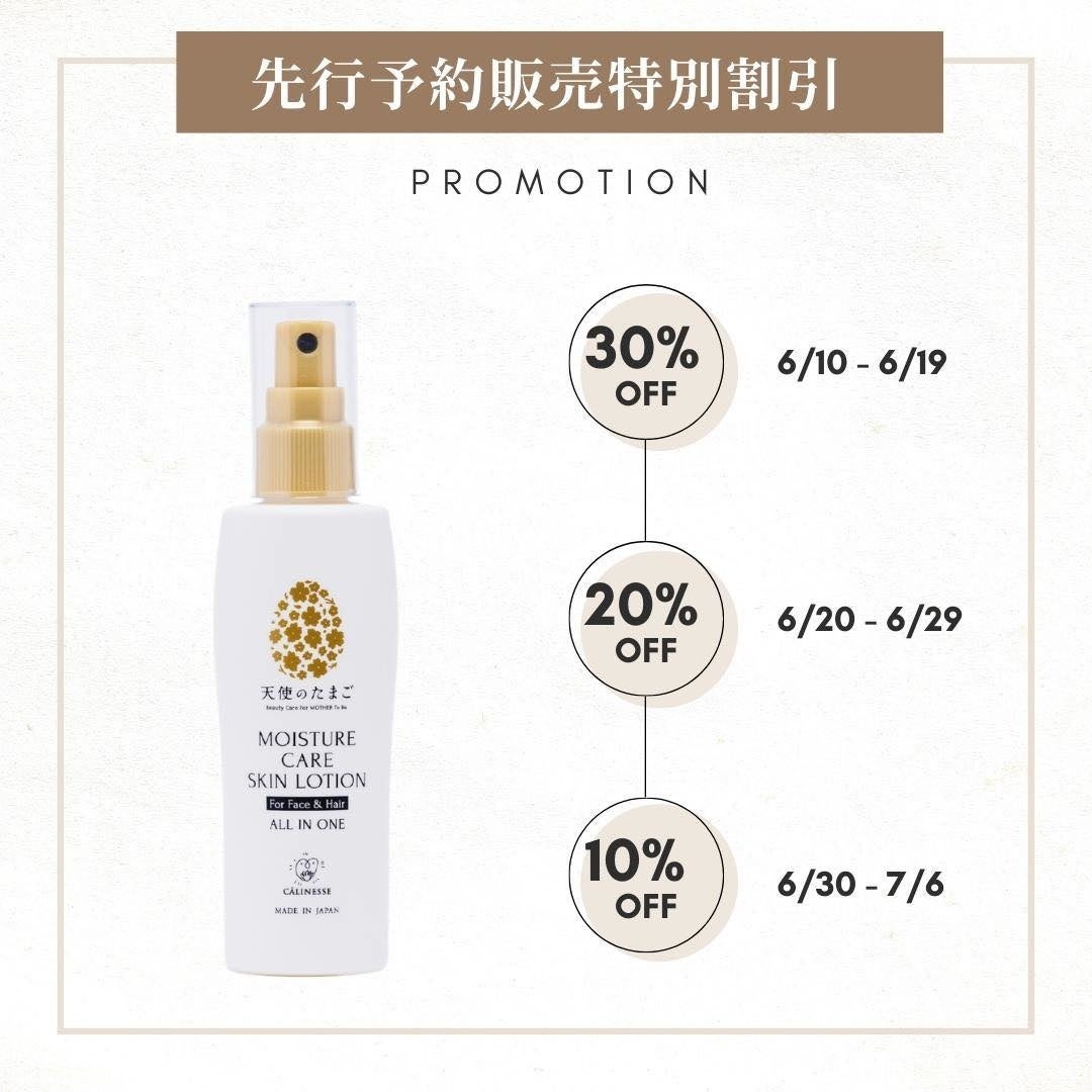 この度、代表藤原の第二子出産を機に1年以上もの歳月をかけ成分選定(独自製法)・試作を繰り返し、自信を持って日本中のママと赤ちゃんに届けたい無添加素材の「天使のたまご オールインワン保湿化粧水」が完成致しました。2022年7月の発売に先駆け、先行予約を6月10日より開始、同時に6月10日から7月6日までの「限定キャンペーン」では、最大30%OFFにて新商品をご購入いただけます。