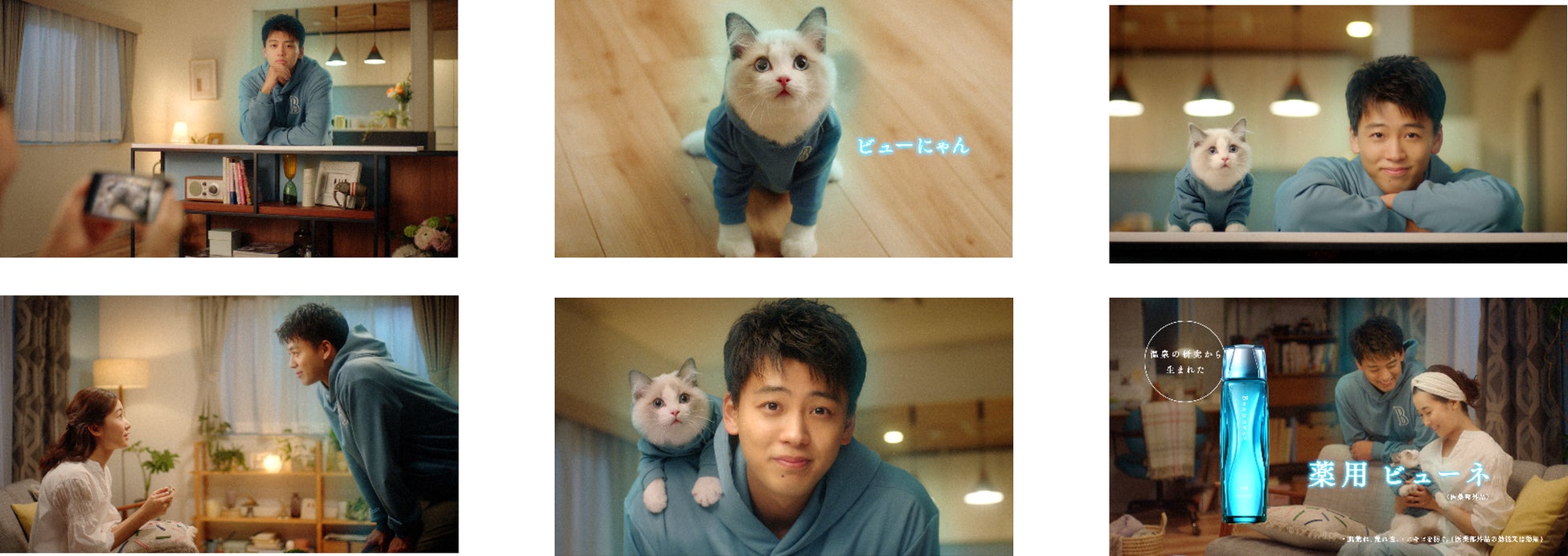 本CMでは、竹内涼真さん演じる「ビューネくん」に、新キャラクター「ビューにゃん」が仲間として加わりました。一日の疲れを動物の動画を見て気持ちを癒やす女性に、おそろいのパーカーを着た「ビューネくん」と「ビューにゃん」が寄り添います。「肌のことは、僕たちにまかせて!」という頼もしくも優しい言葉をかけながら女性の肌にパッティングし、肌と心を前向きに導きます。ラストシーンでは、ビューネくんが「任務完了!」と微笑みながらビューにゃんとハイタッチ。ビューネくんとビューにゃんの癒しシーン満載の本CMにご注目ください。