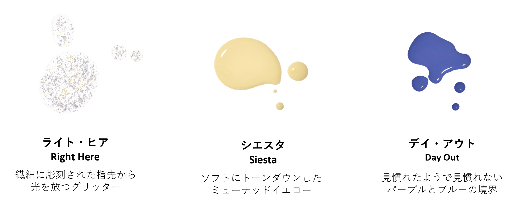 今回、新色が登場するのは、透明感のある陰影が鮮明な印象を演出する「ニューデップスアイシャドウ」。シンプルながら鮮明な存在感のあるカラーが特徴で、ふわっと仕上がるテクスチャーに好評をいただいています。新色は、夏のイメージが名前になった3色をラインナップ。ニューデップスアイシャドウからは初のグリッターも登場します。さらに、塗り重ねるごとにさまざまな色味のニュアンスを楽しむことができることが特徴のネイルポリッシュ「グロウアップネイルカラー」からは、夏限定のカラー3種がラインナップします。ネイルからも初めてのグリッタータイプが登場。