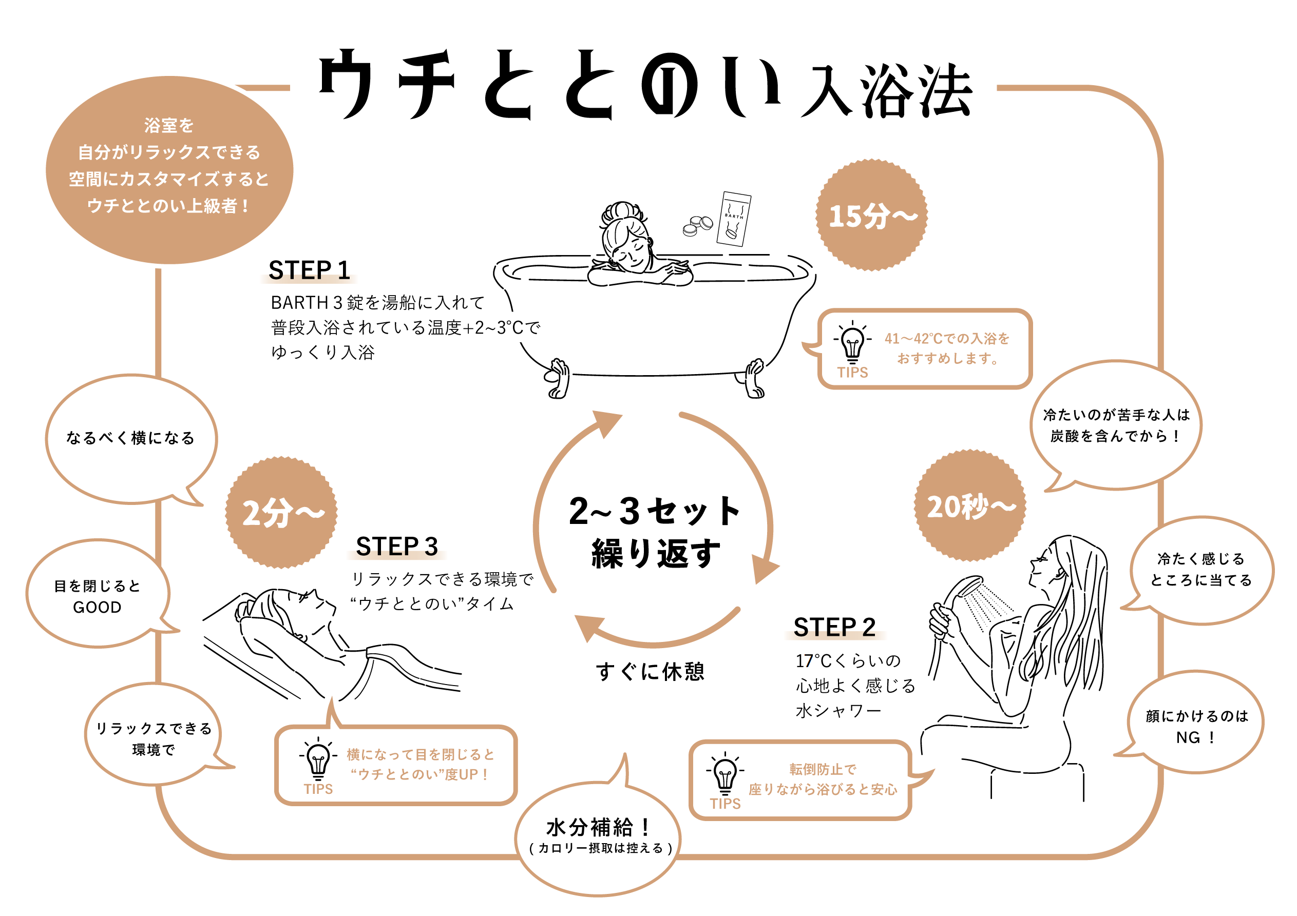 【お風呂⇒水シャワー⇒休憩】のサイクルを下記入浴法で実施すると、より「ととのい」に近づけます。
