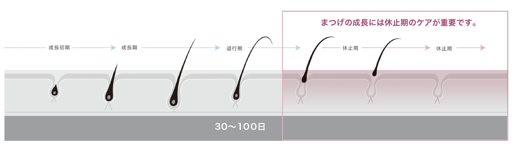 まつげの毛周期は30~100日とされ、他の体毛よりサイクルが早いことが特徴です。毛母細胞が細胞分裂を始める「成長初期」・毛が伸びて表皮に達する「成長期」・毛が抜け落ちる「退行期」・毛母細胞が次の成長期に備える「休止期」のおおよそ4 周期に分かれます。成長初期、成長期にある毛は15~20%といわれ、80%前後の毛が「退行期」「休止期」にあたります。