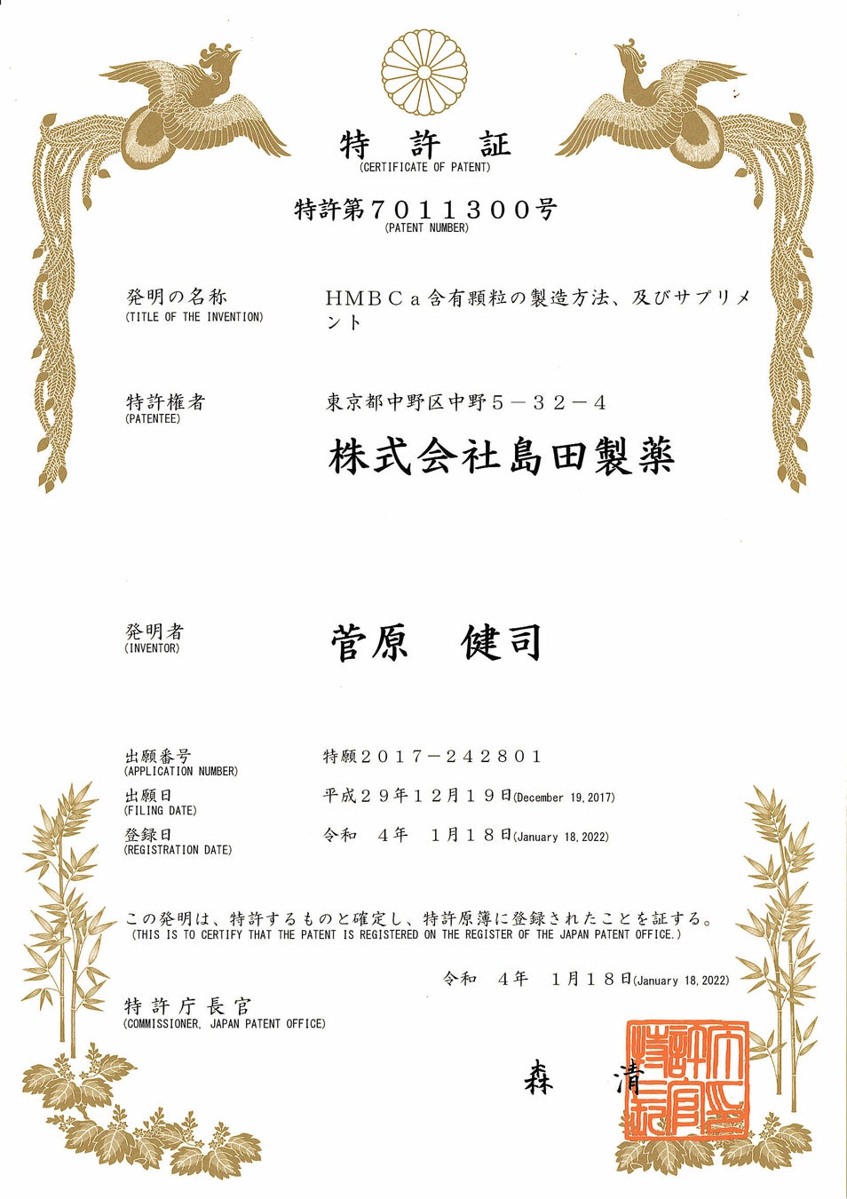 島田製薬では、2017年にHMBCa含有顆粒の製造方法の特許申請を行い、2022年遂にその申請が認可され、特許取得が実現しました。(特許第7011300号)