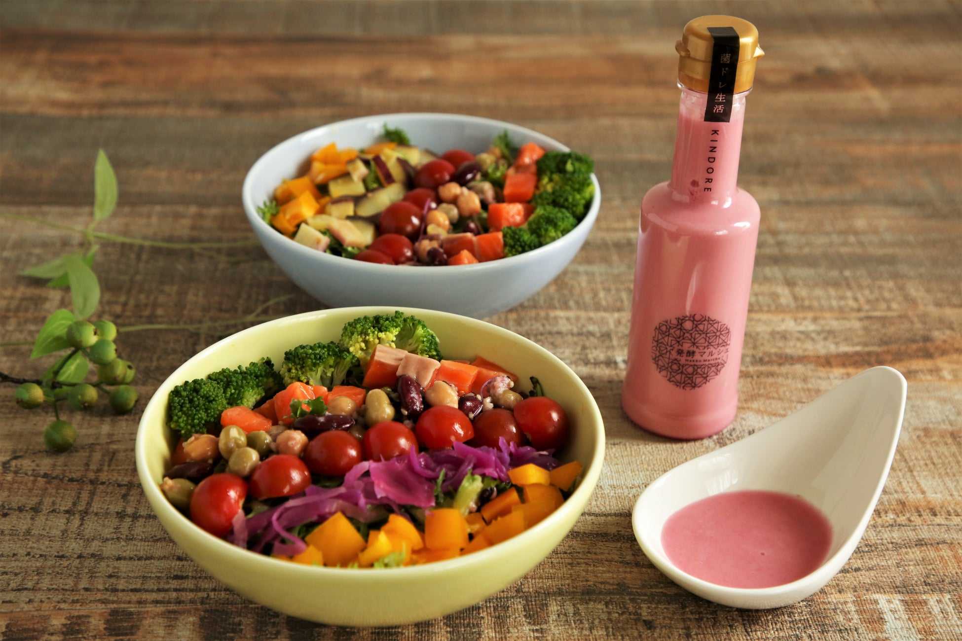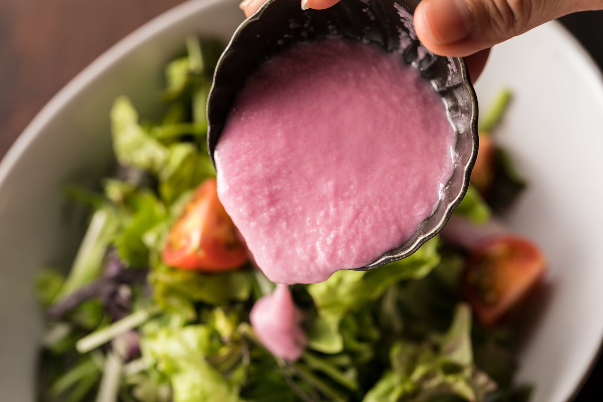 野菜を発酵させた手作りドレッシングです。 今までのドレッシングの常識を覆すコク深さとマイルドな味わいは発酵のおかげ。 お砂糖は一切使用せず、発酵させたお米とお野菜の自然な甘さだけ。カラフルな色合いもお野菜本来の色合いです。