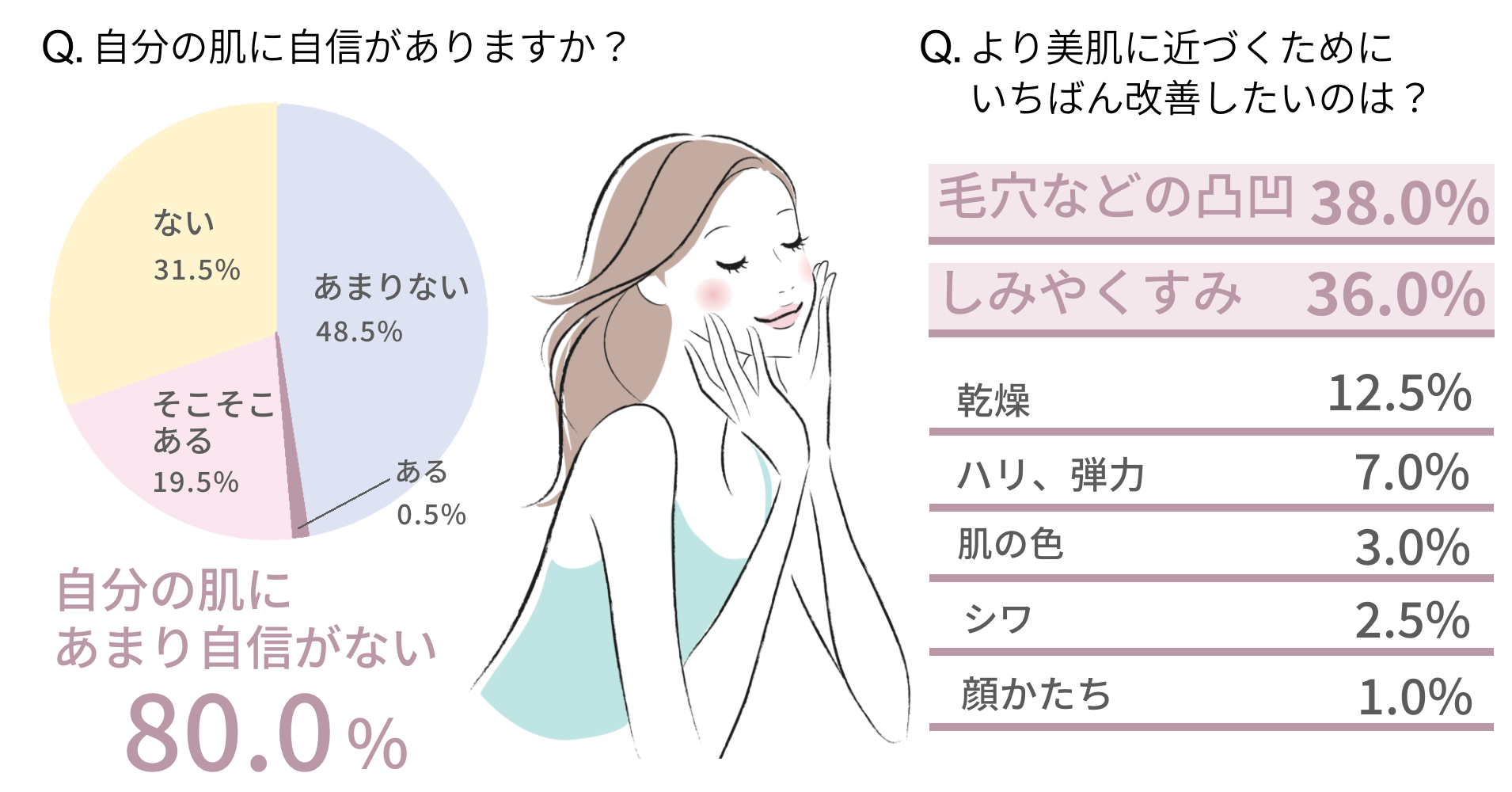- 自分の肌に「自信がない」女性は80%。いちばんの悩みは?