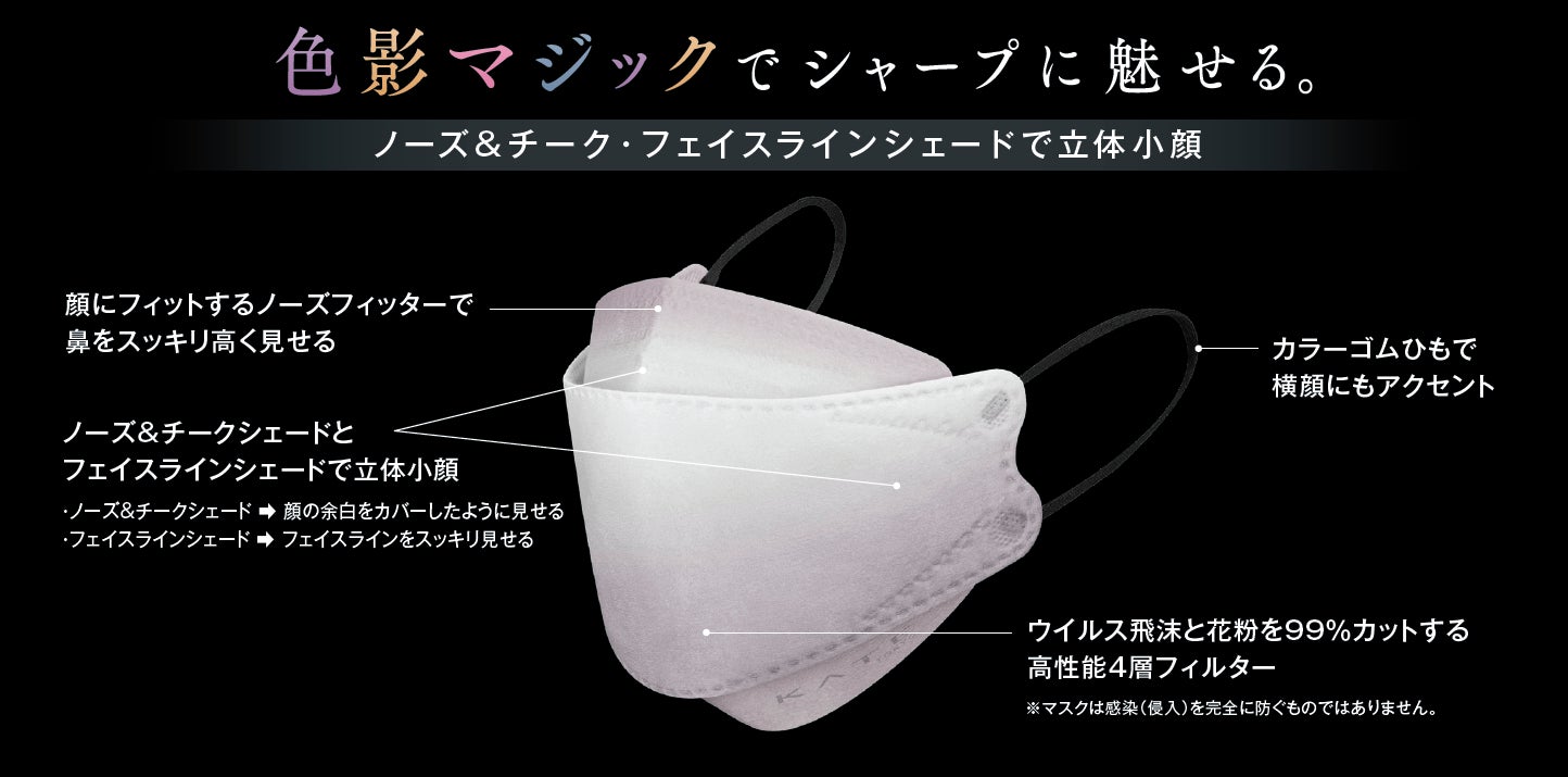 今回発売する「小顔シルエット不織布マスク」は、マスクにノーズ&チークシェードとフェイスラインシェードの色影マジックのデザインを施すことで、シャープで立体的な小顔印象に導きます。さらに、ウイルス飛沫と花粉を99%カットする高性能4層フィルター※を採用しました。