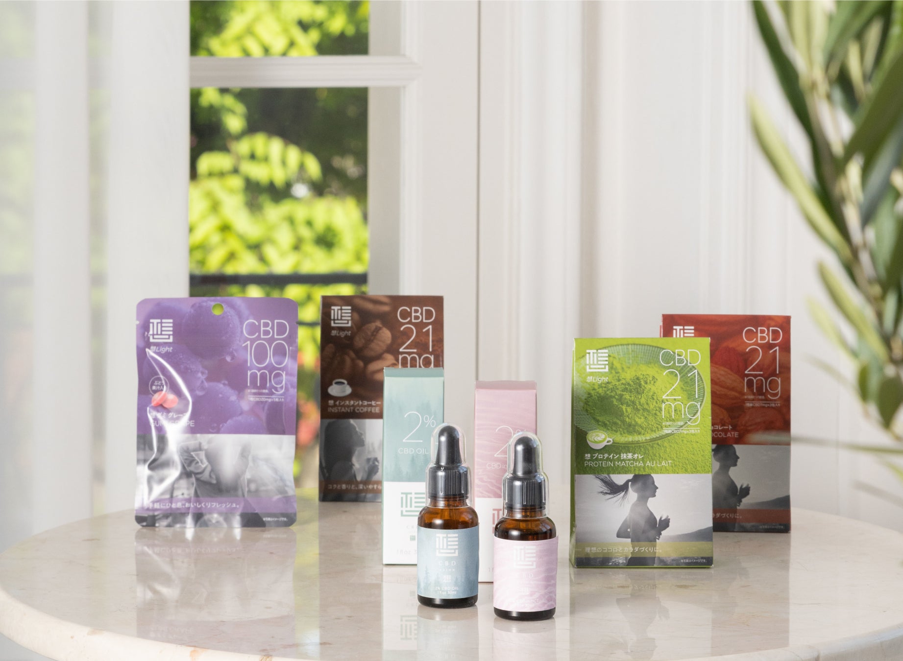 CBDを配合したオイル、CBDを配合したグミ、CBDを配合したインスタントコーヒー、CBDを配合した抹茶オレ味のプロテインと、チョコレート味のプロテインを、