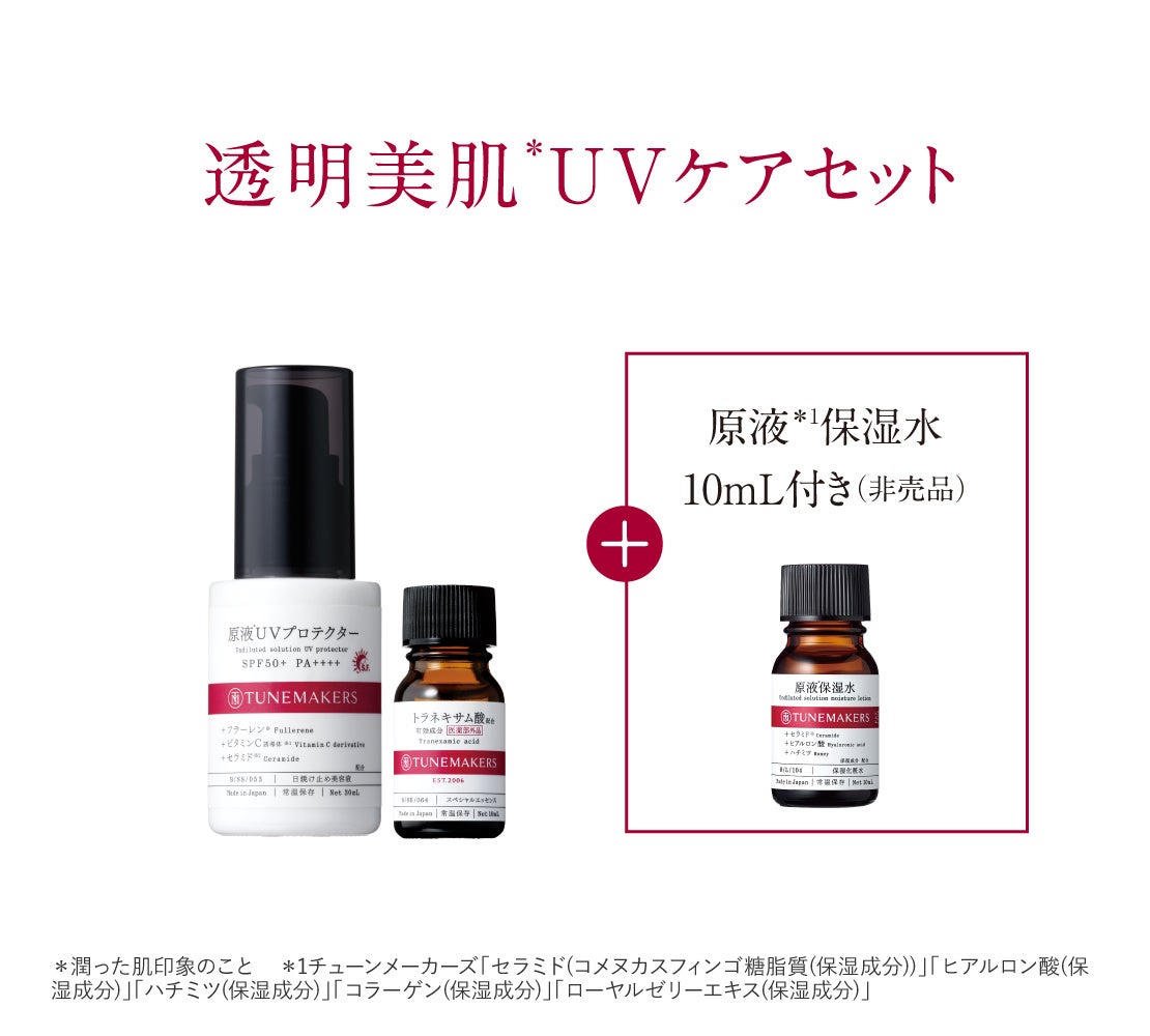 原液を混ぜて、肌を集中的に守りながら紫外線ダメージもケアする「原液UVプロテクター」に、シミのもとメラニンの過剰生成の指令を止めることでシミの発生を抑える、TUNEMAKERS初の医薬部外品の原液「トラネキサム酸※」がセットになった「透明美肌UVケアセット」。