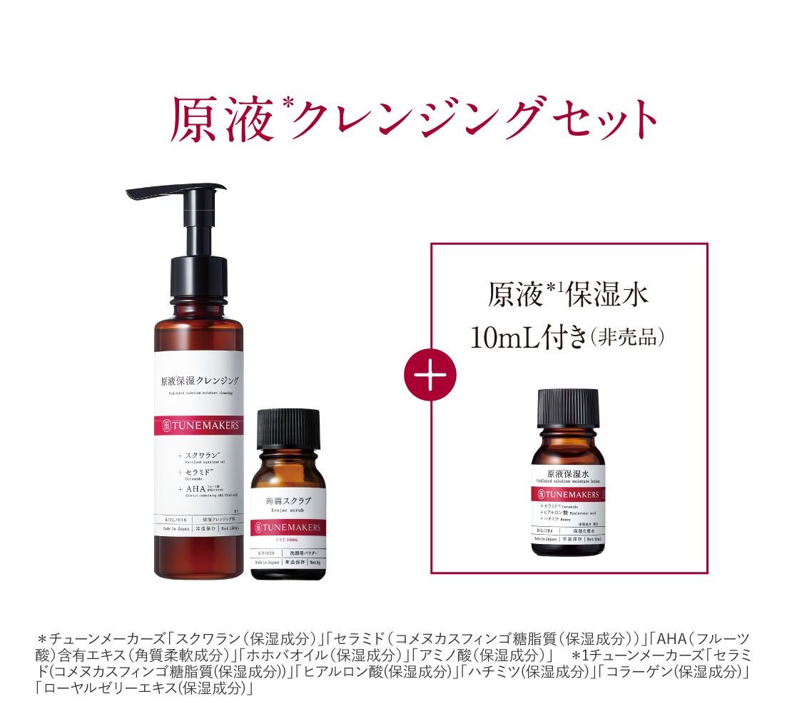 落ちにくいメイクまでしっかり落としながら、潤いを与える5種の原液を独自の比率で調合した「原液保湿クレンジング」と、やさしい使い心地で毛穴の奥から古い角質や汚れや角栓をしっかり吸着し、洗い流すとすべすべの柔らかな肌へ導く「蒟蒻スクラブ※」がセットになった「原液クレンジングセット」。